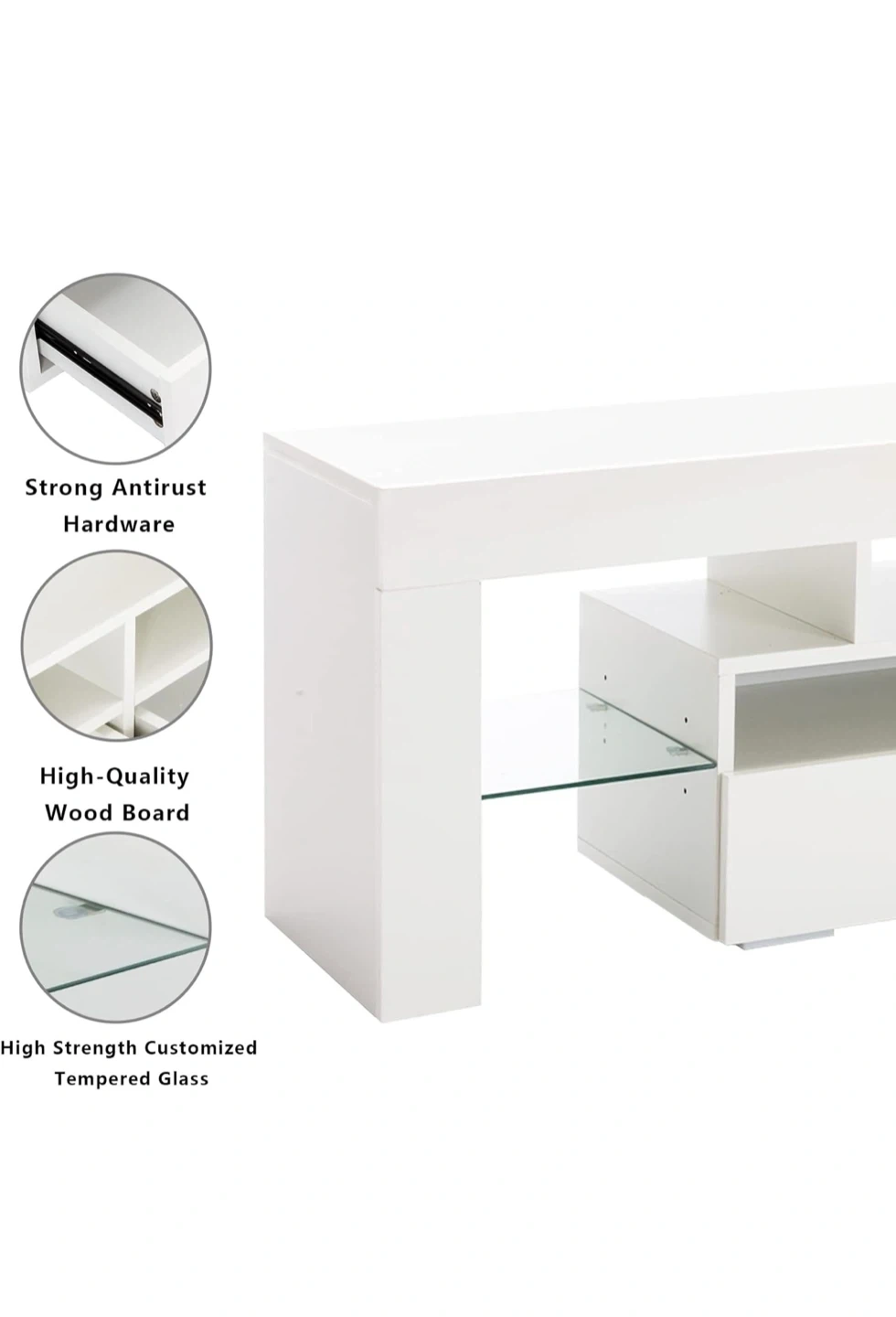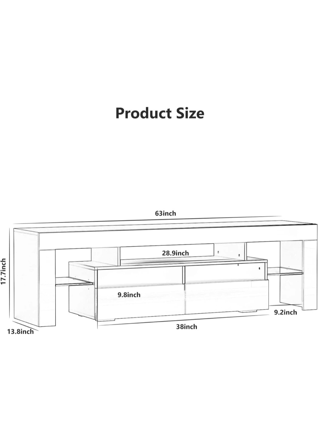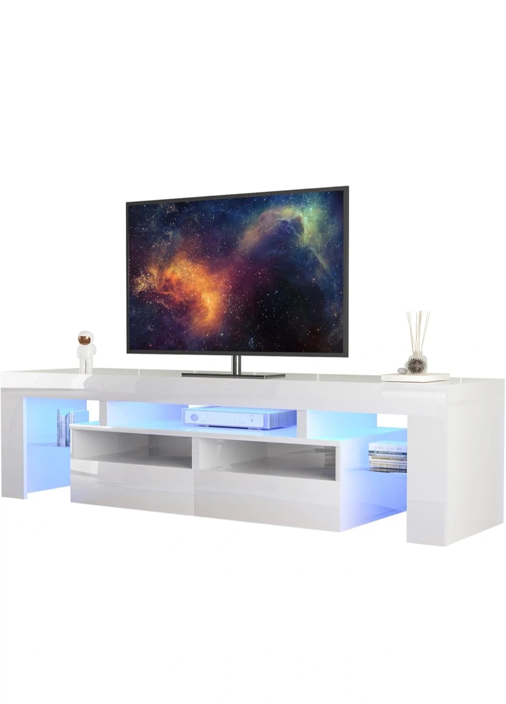 Selling a sleek white LED TV stand! It's 63 inches wide, 17.7 inches tall, and 13.8 inches deep. The stand features cool blue LED lighting to add a modern touch to your living room