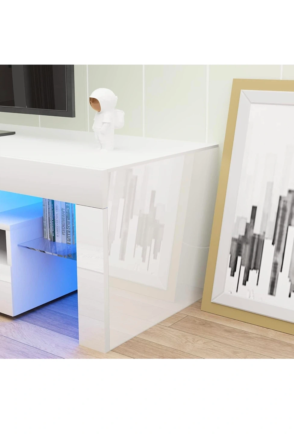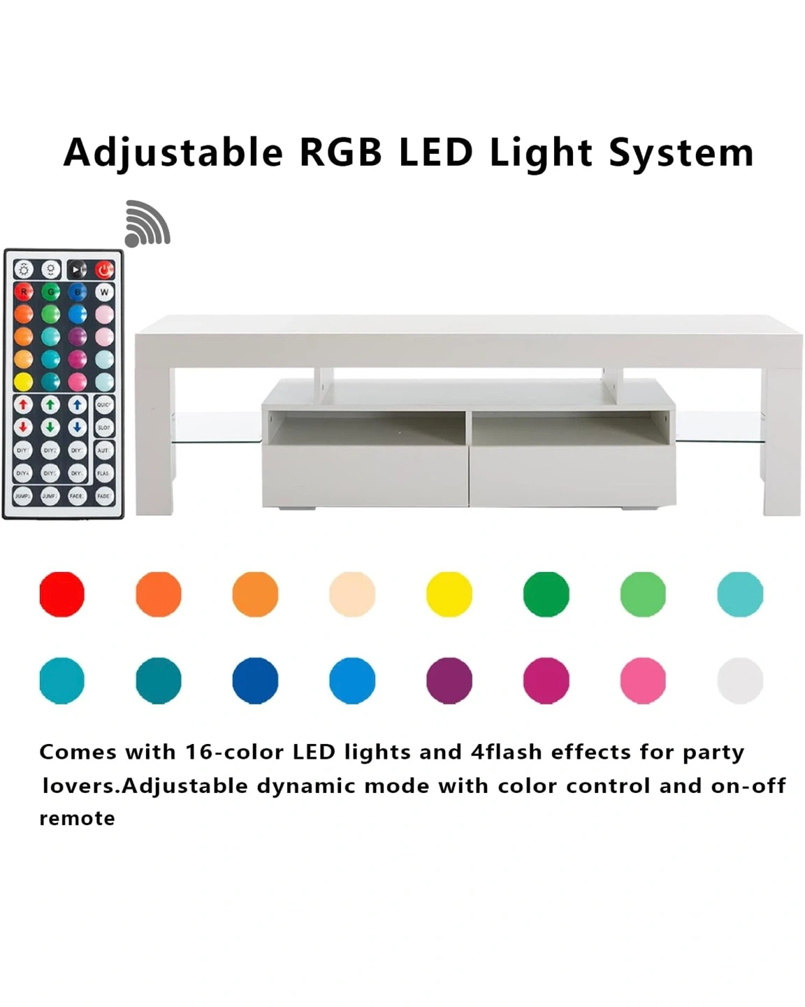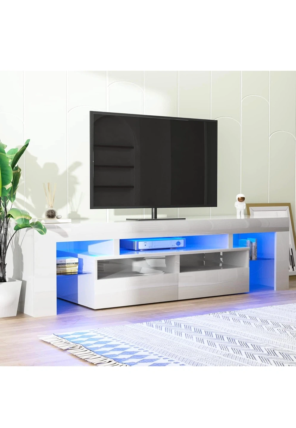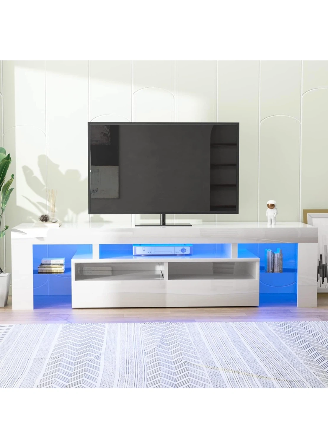 Selling a sleek white LED TV stand! It's 63 inches wide, 17.7 inches tall, and 13.8 inches deep. The stand features cool blue LED lighting to add a modern touch to your living room