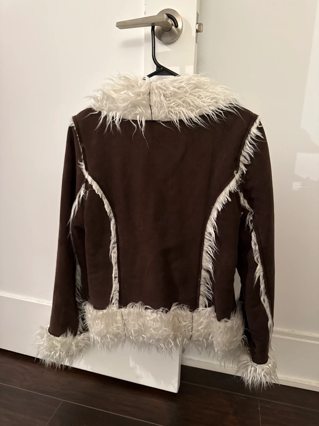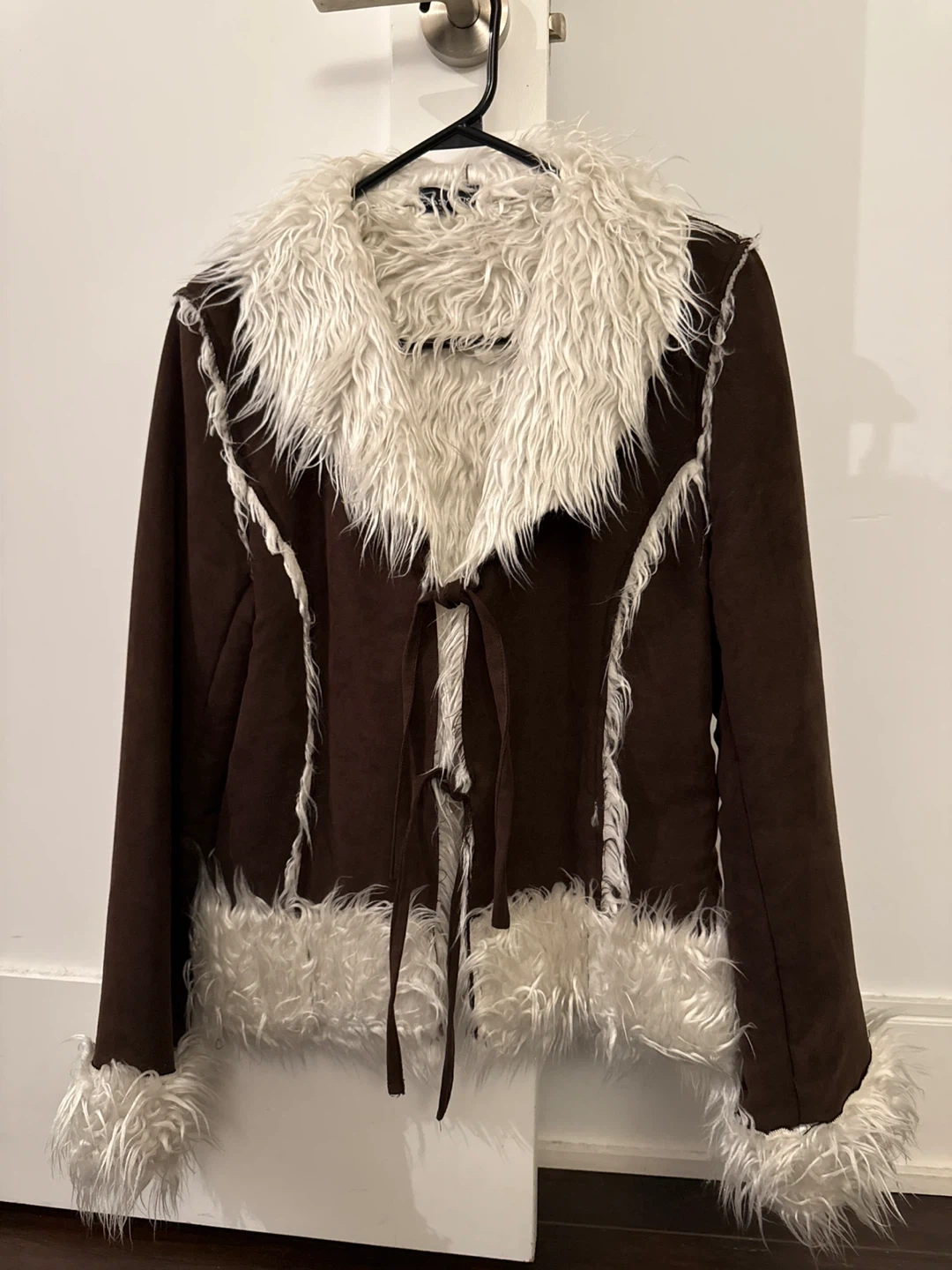 Here's a cute brown jacket with a faux suede feel and fluffy fur trim! It's perfect for adding a bit of flair to your outfit. The jacket has a tie closure in the front. Size S