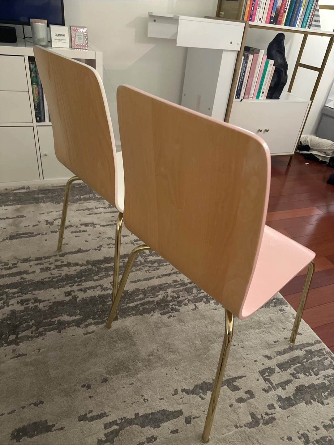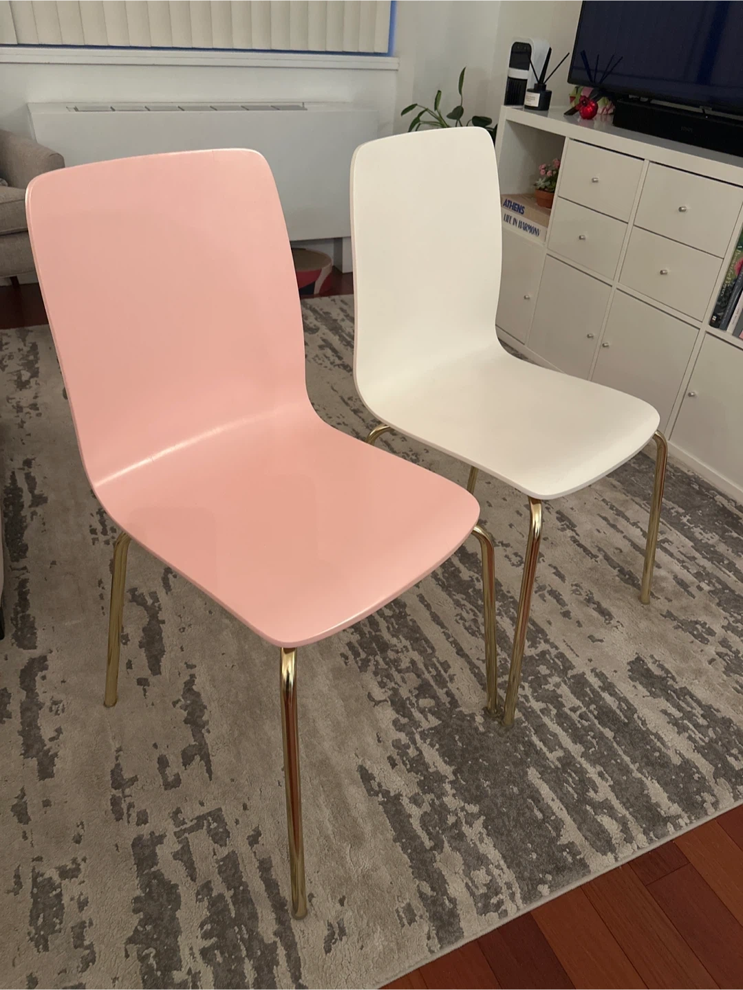 Selling a set of four modern dining chairs. Two of them is a lovely light pink and the other two are white. They're in great condition and would look great in any dining room or kitchen!