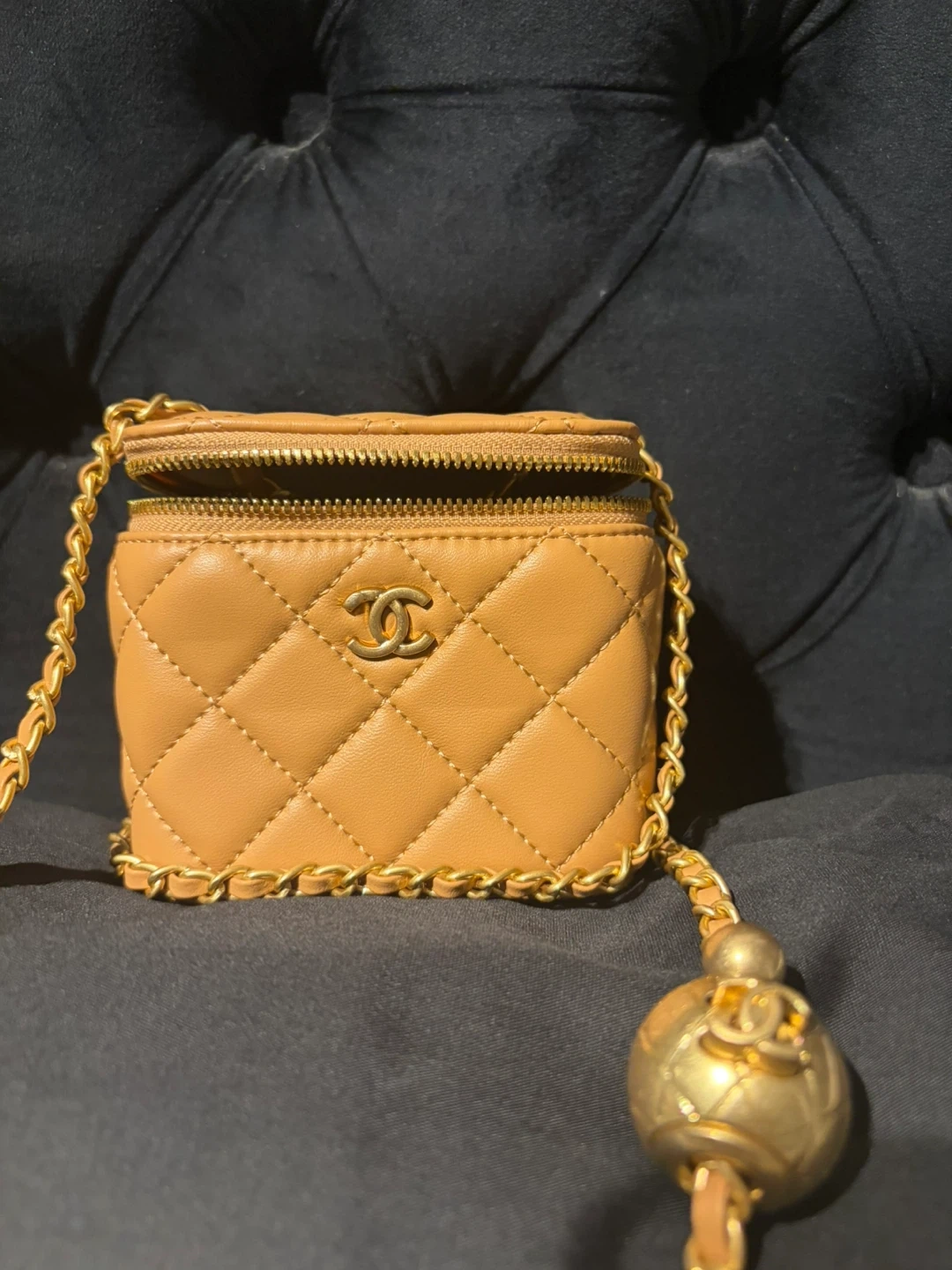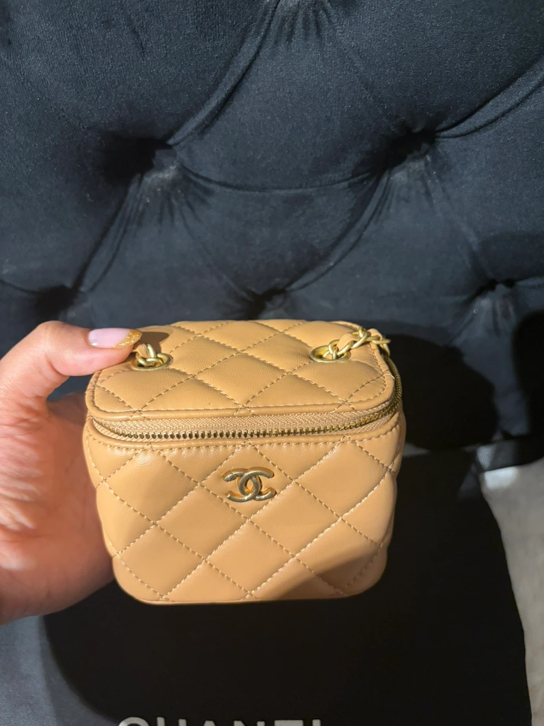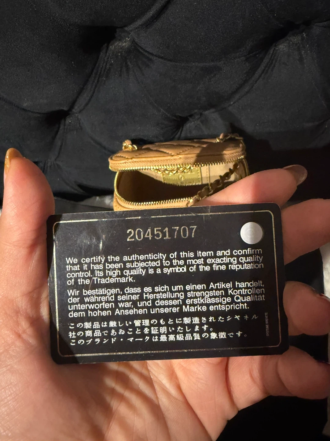Selling a Chanel Vanity Mini Bag with Chain. It's in great condition and comes with a authenticity card. The bag features a quilted design and a gold chain strap. Perfect for adding a touch of luxury to any outfit! 10cm across and adjustable strap