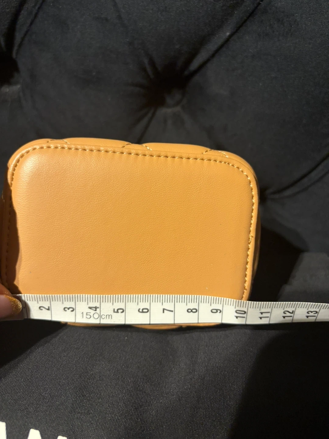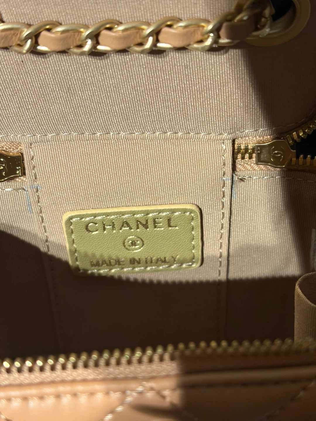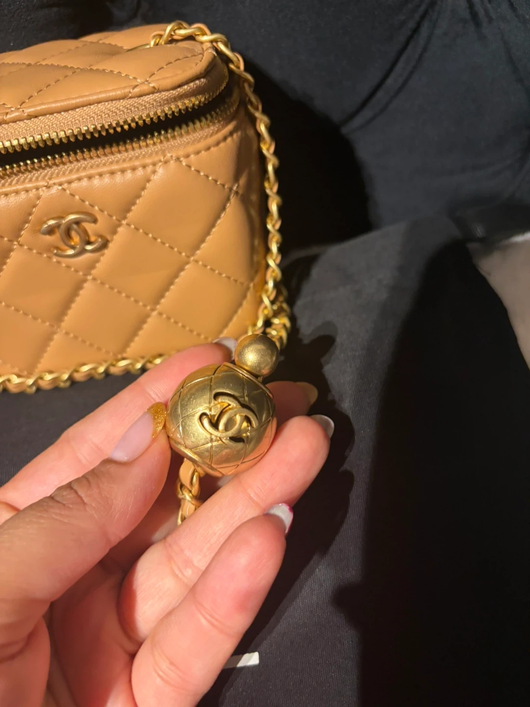 Selling a Chanel Vanity Mini Bag with Chain. It's in great condition and comes with a authenticity card. The bag features a quilted design and a gold chain strap. Perfect for adding a touch of luxury to any outfit! 10cm across and adjustable strap