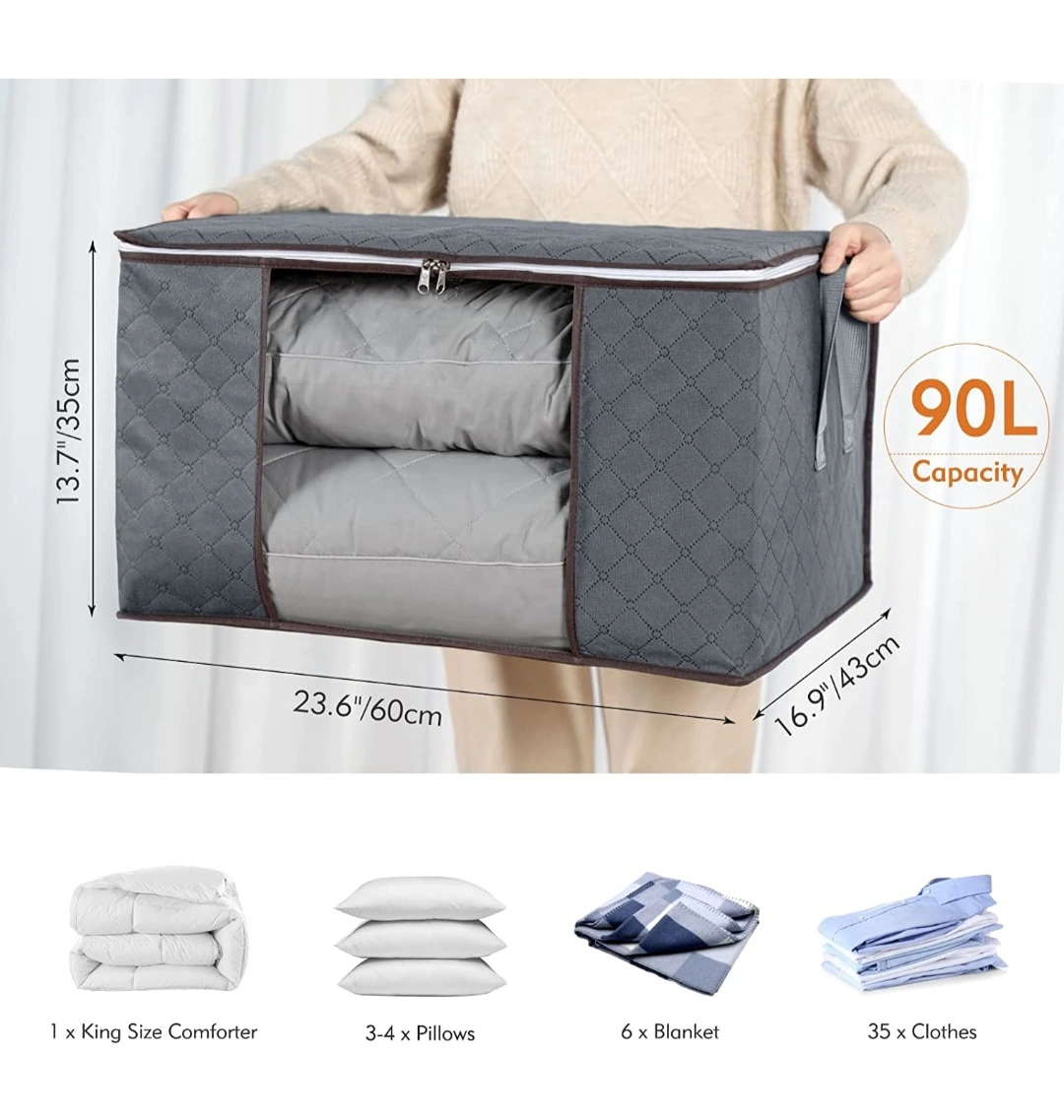 official description: Large Capacity - Storage bag measures 23.6β x 16.9" x 13.7" / 60 x 43 x 35 cm, with capacity 90L. It is spacious for seasonal clothing, blankets, holiday decorations, baby clothes, comforters, etc.