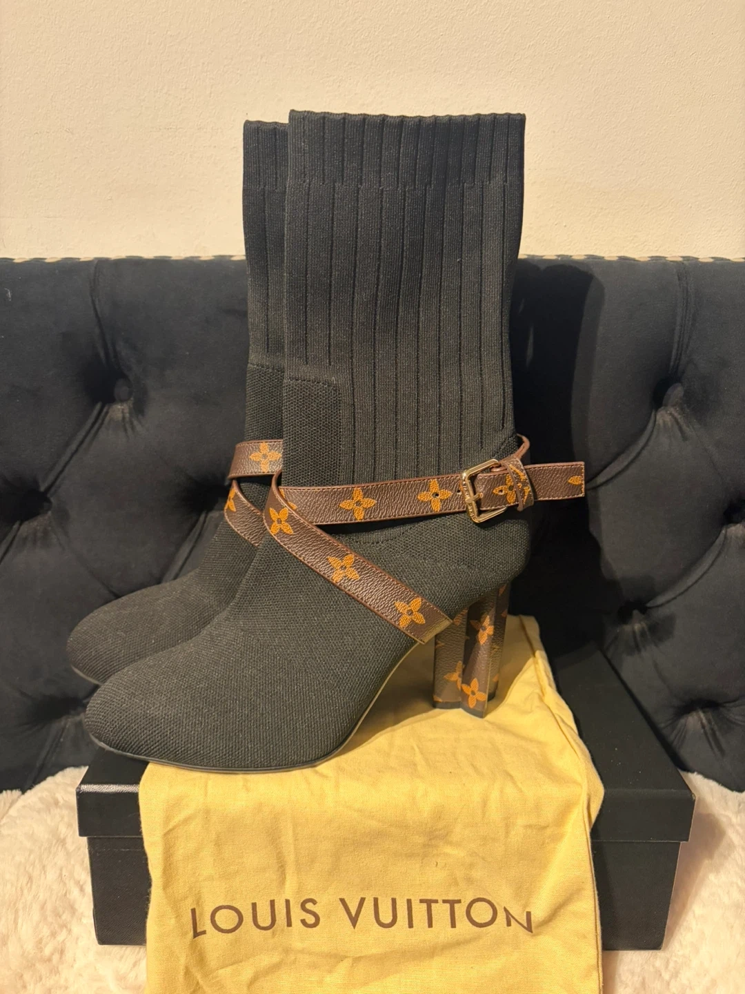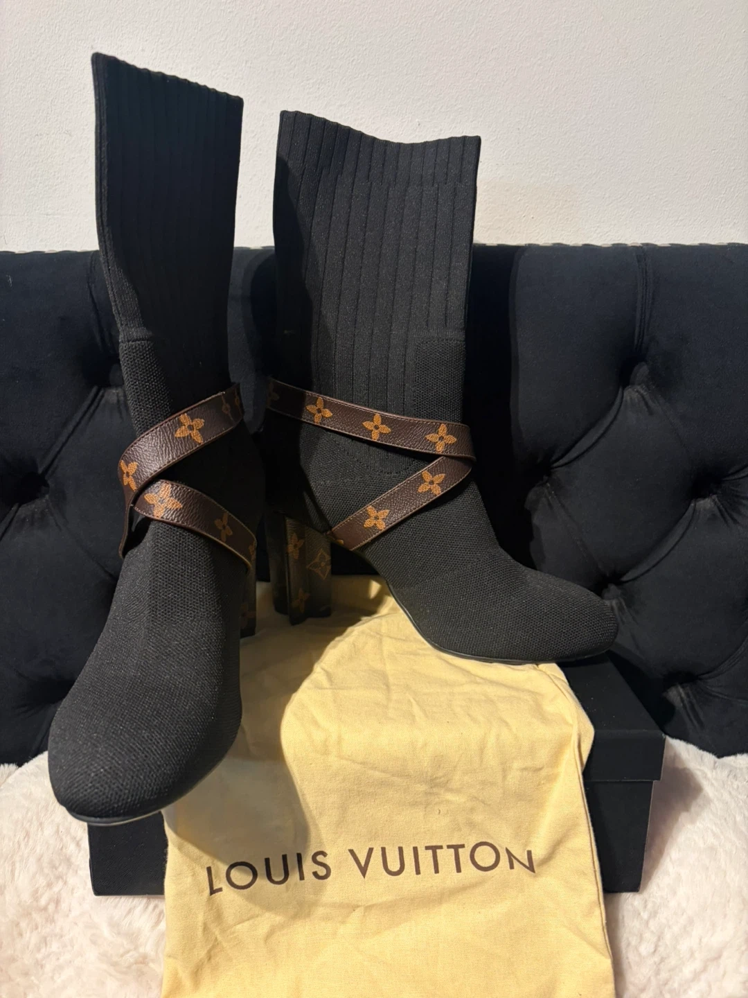These stylish Louis Vuitton black heel boots are in great condition. The iconic LV design on the straps adds a touch of luxury to any outfit