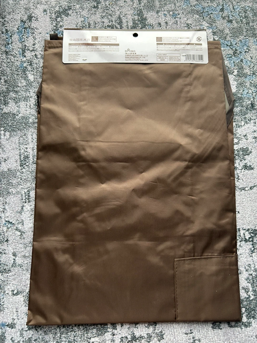 I'm selling a new Daiso waterproof apron. It is brown and features a small pocket on the front. Perfect for keeping clothes clean while cooking or crafting!