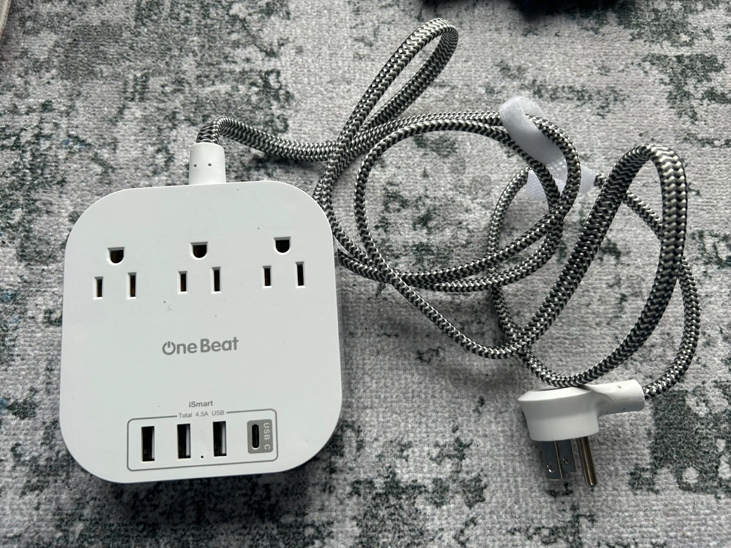 Selling a One Beat power strip! It features three standard outlets, three USB ports, and one USB-C port. Approx 5 feet long, never used.