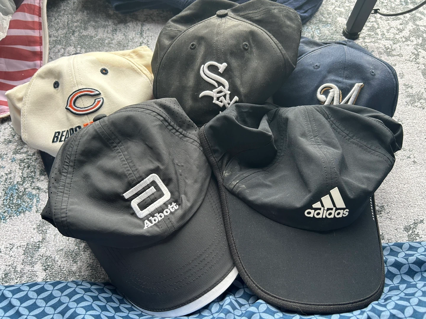 Selling a collection of assorted baseball caps. Includes brands like Adidas, and teams like the Chicago Bears, White Sox, and Milwaukee Brewers. Also includes an Abbott branded cap. Variety of styles and colors!