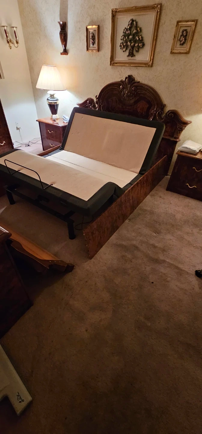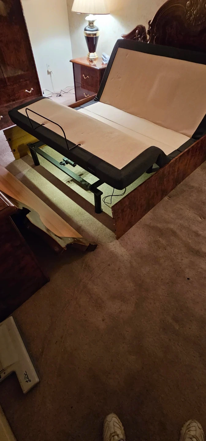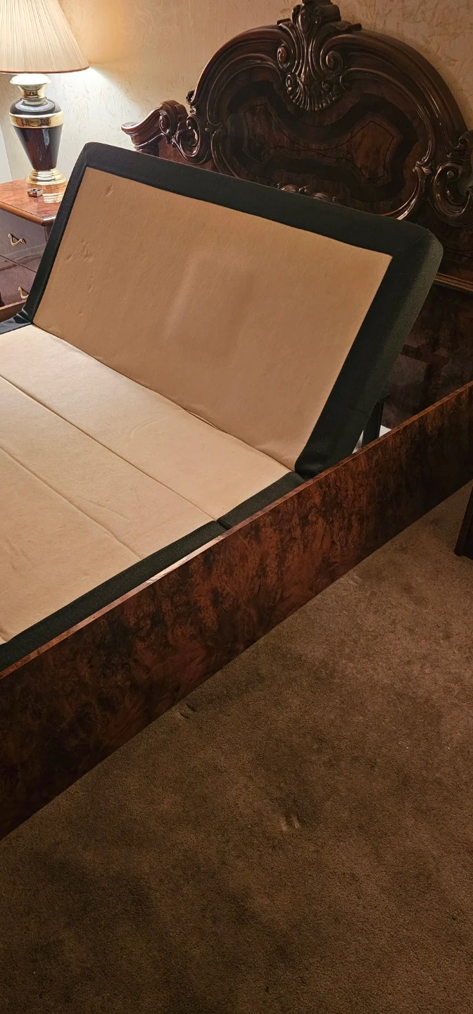 Queen size adjustable bed frame. It comes with a remote to adjust the bed to your desired position. Great for reading or watching TV in bed! Has vibrating massager and on one side has a light underneath.