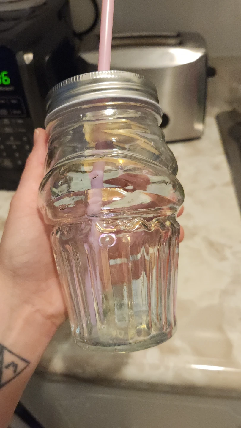 Super cute mason jar cup that looks like a cupcake. It is transparent with iridescence for colouring and a light pink straw.