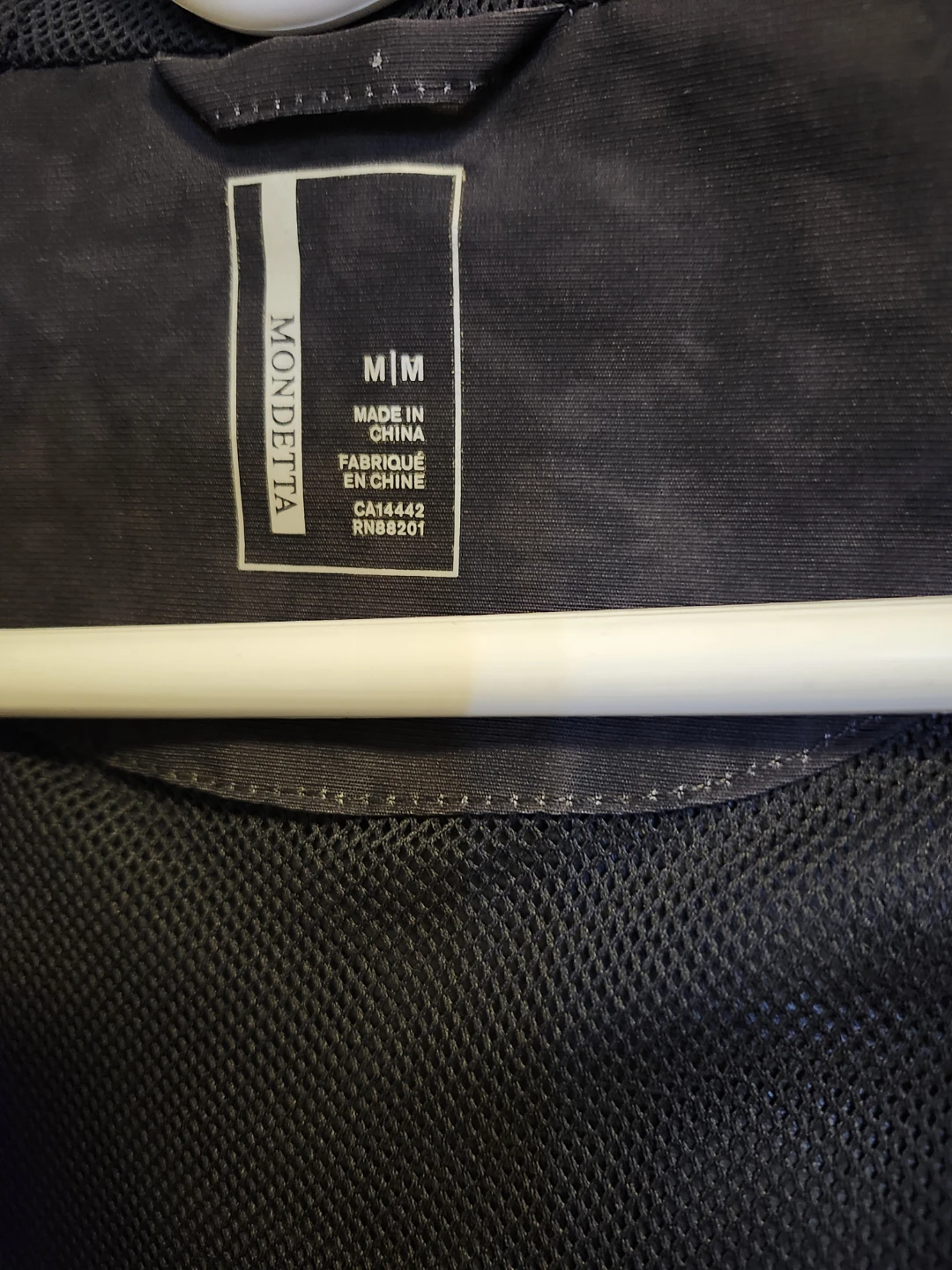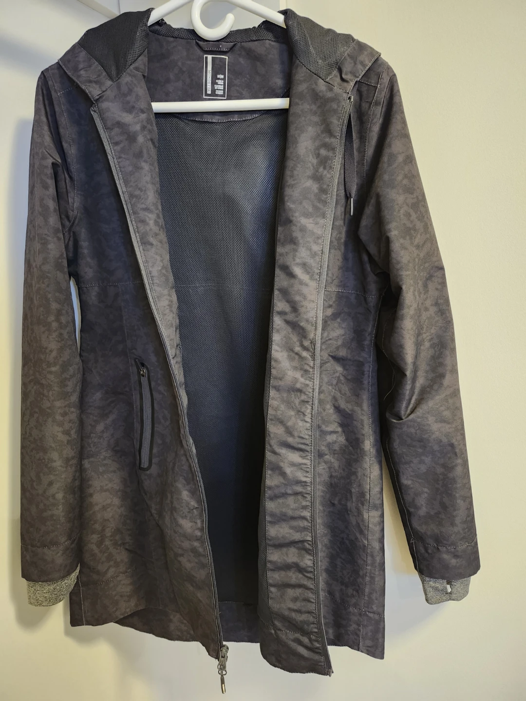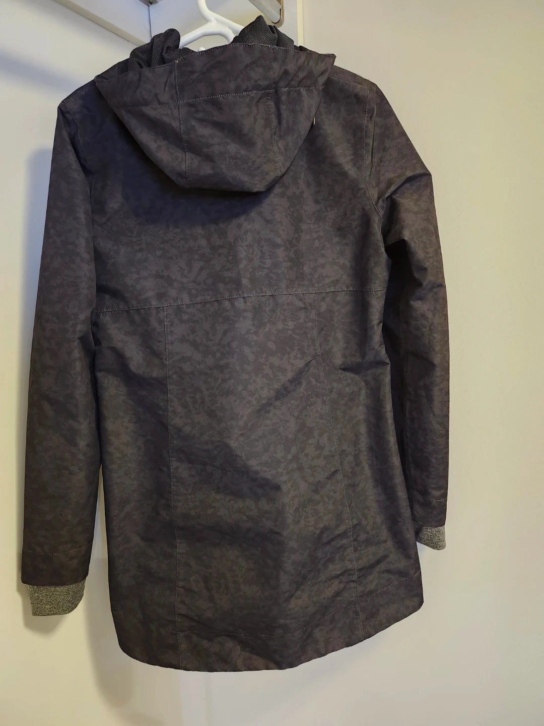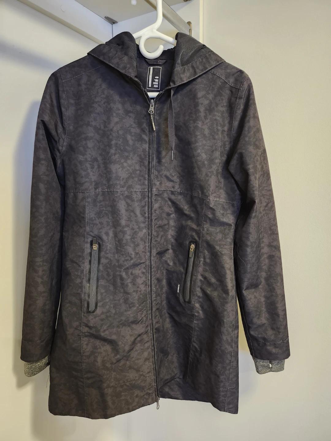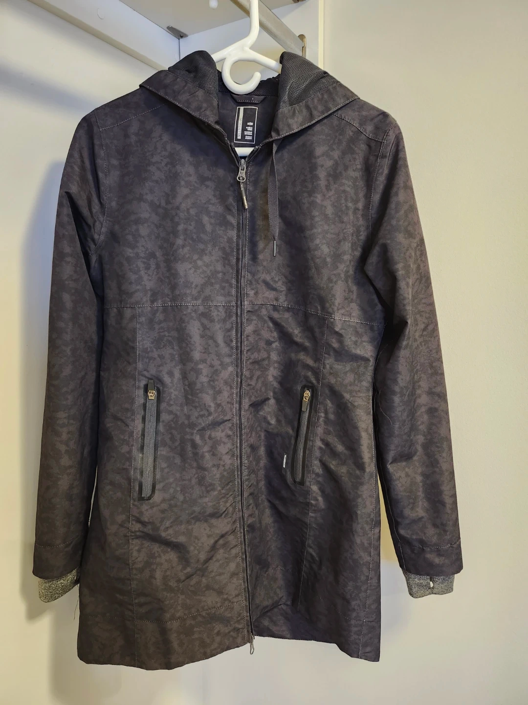 Selling a Mondetta women's hooded rain repellant jacket/coat in size medium. The jacket features a stylish black mottled pattern and flattering tapered fit, with knit undercuffs for extra warmth.