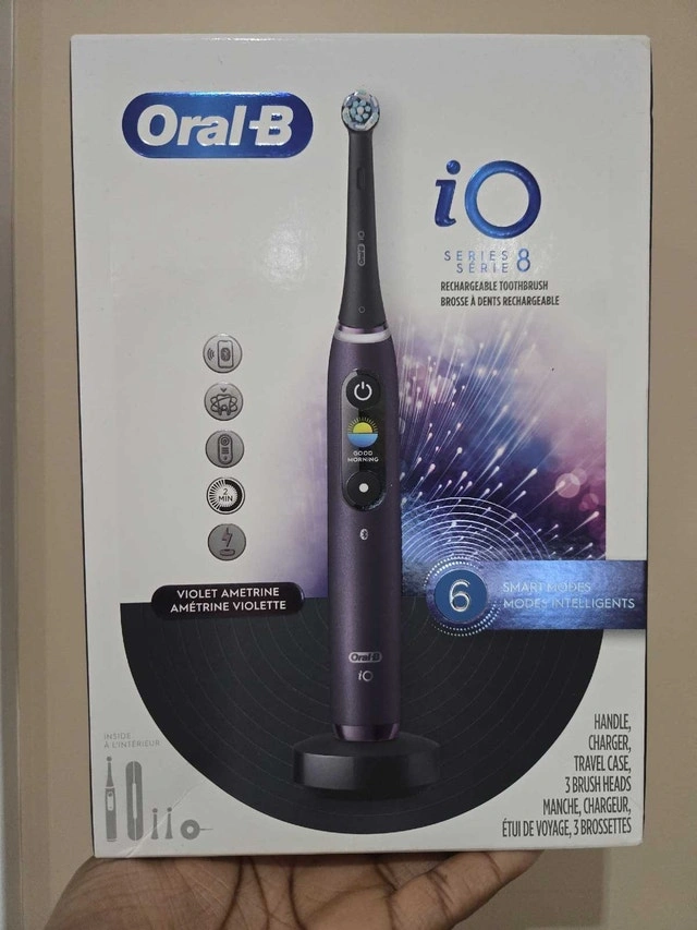 I'm selling a new Oral-B iO Series 8 Violet Ametrine rechargeable toothbrush that features six smart modes for personalized cleaning. This toothbrush comes with a handle, charger, a travel case, and three brush heads.