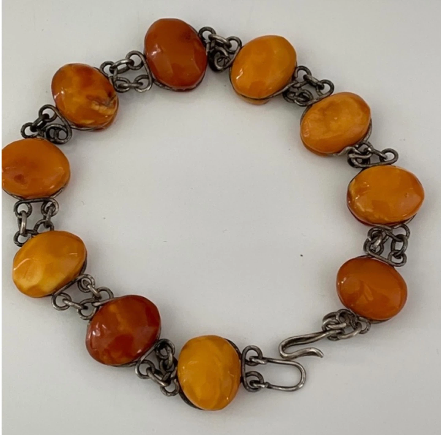 Selling a vintage amber bracelet with a silver-tone chain. The amber stones are a beautiful orange colour. This bracelet is in good condition and ready to wear!