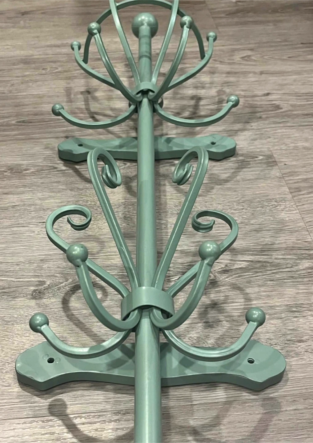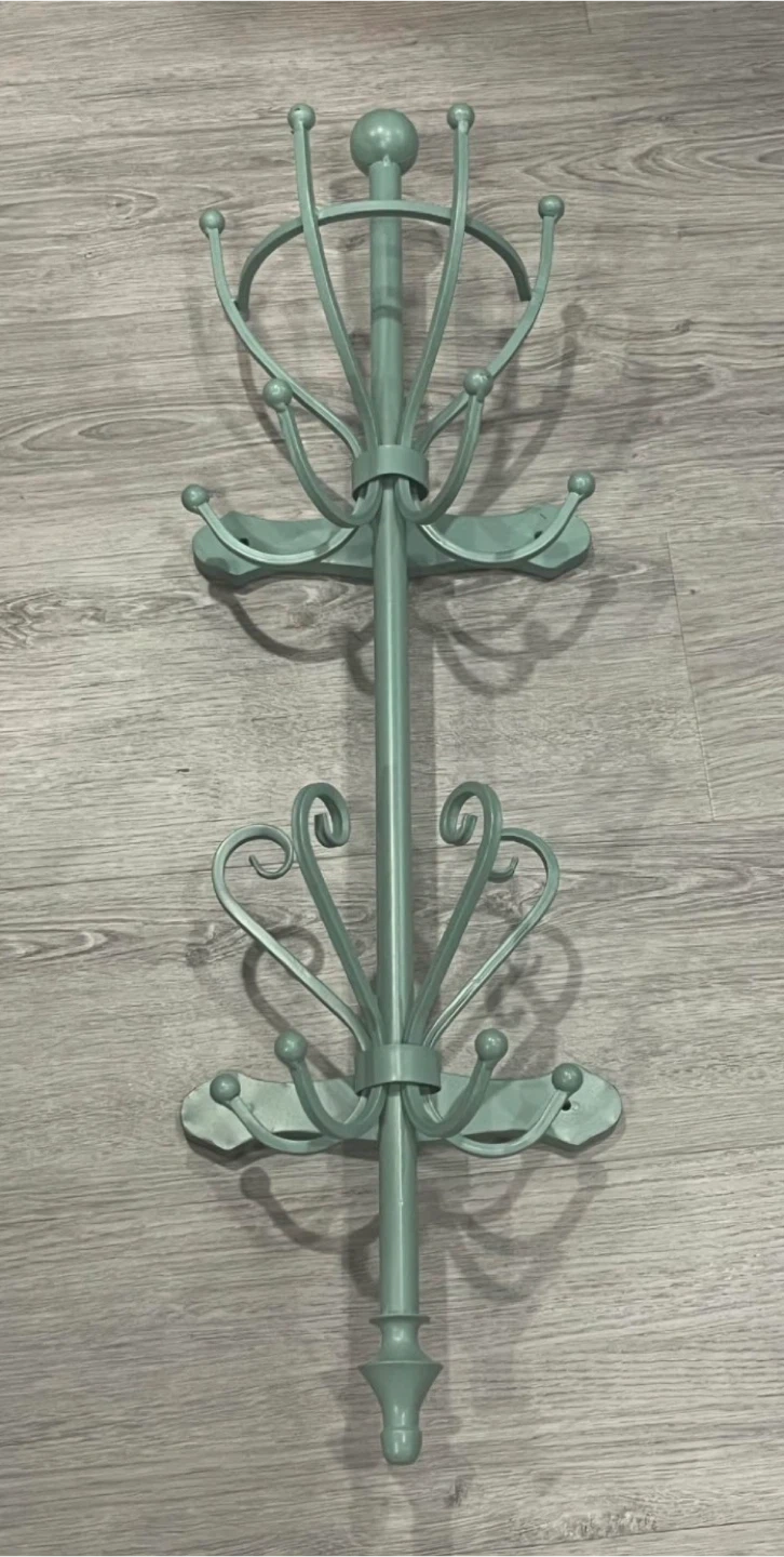 Selling a mint green coat rack in great condition! It's perfect for hanging coats, hats, and bags. It has a unique design that will add a touch of style to any room
