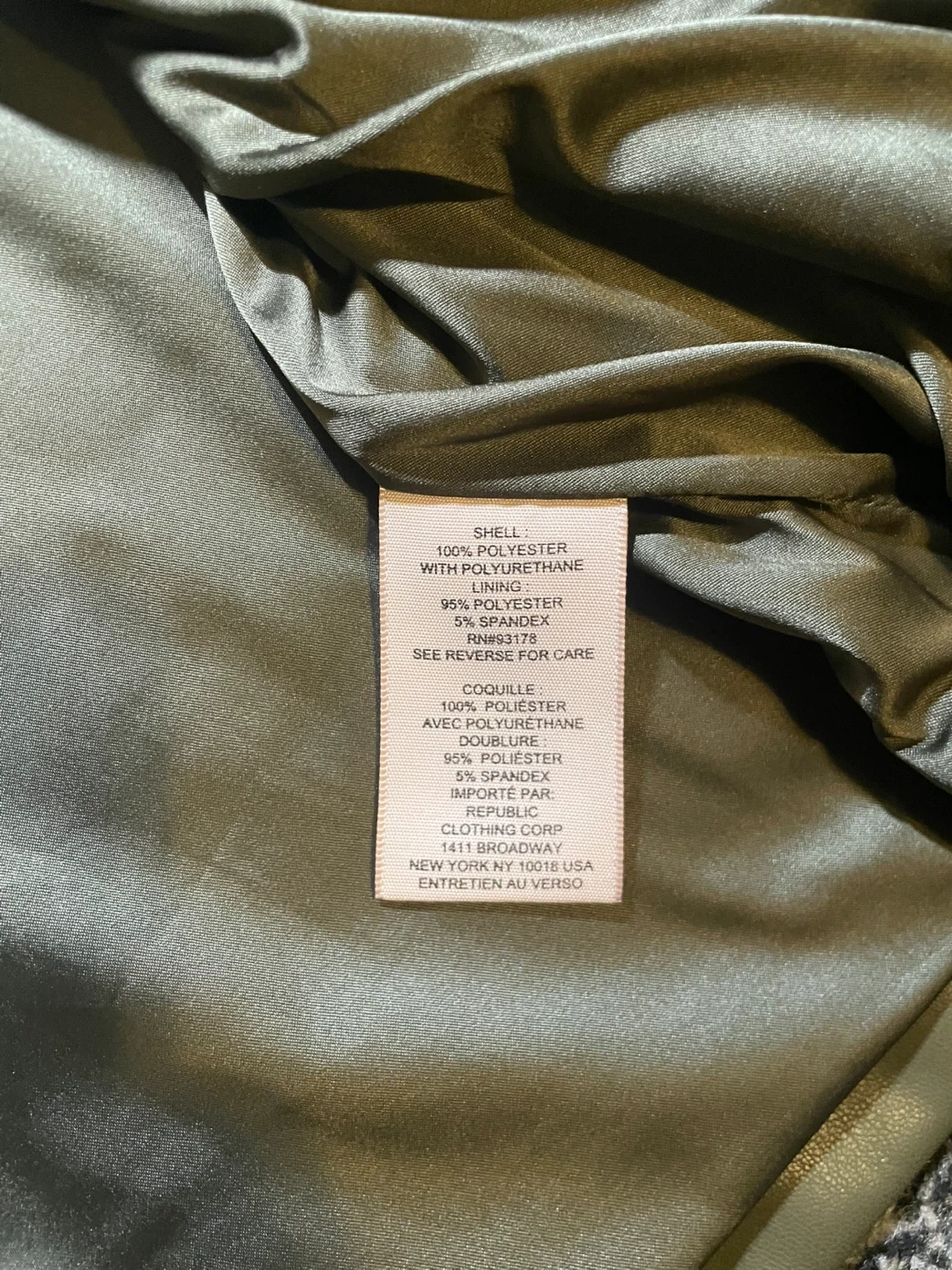 Selling a Philosophy Republic Clothing jacket in olive green! It's a size 8 and made with a shell of 100% polyester with polyurethane, and a lining of 95% polyester and 5% spandex. Great for adding a stylish touch to your outfit! It’s in good condition, and is synthetic leather. Bought it for 65 dollars on winners! Used once only for about 3 hours!