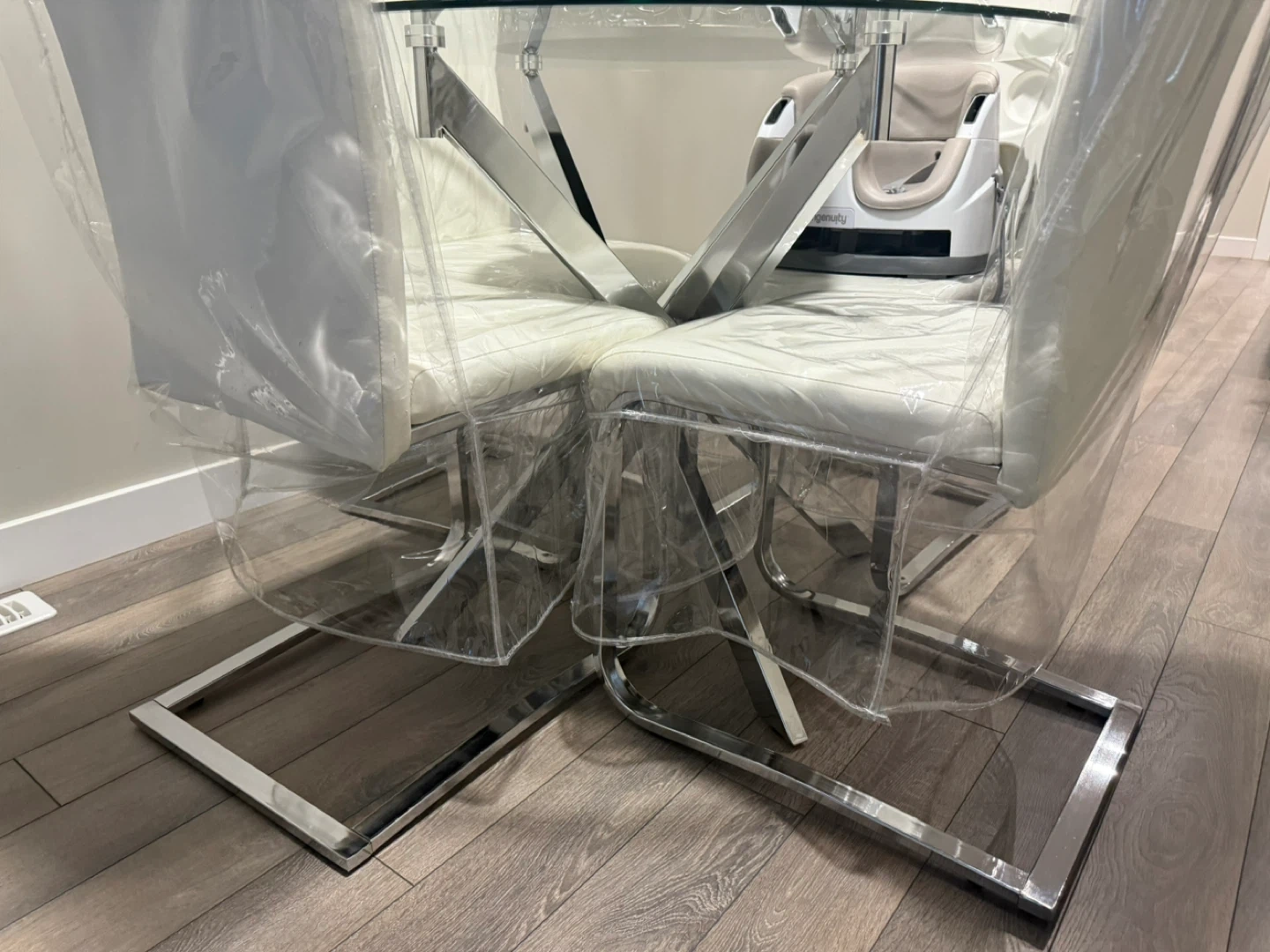 Selling a modern glass dining table with four white chairs. The chairs have a sleek design with chrome legs. Perfect for a small dining area or kitchen!