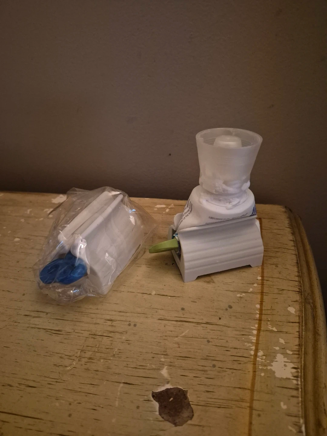 I'm selling a set of toothpaste tube squeezers, still new in their packaging! These are great for getting every last bit out of your toothpaste tube, and they help keep your bathroom tidy. One is out of the packaging to show how it works