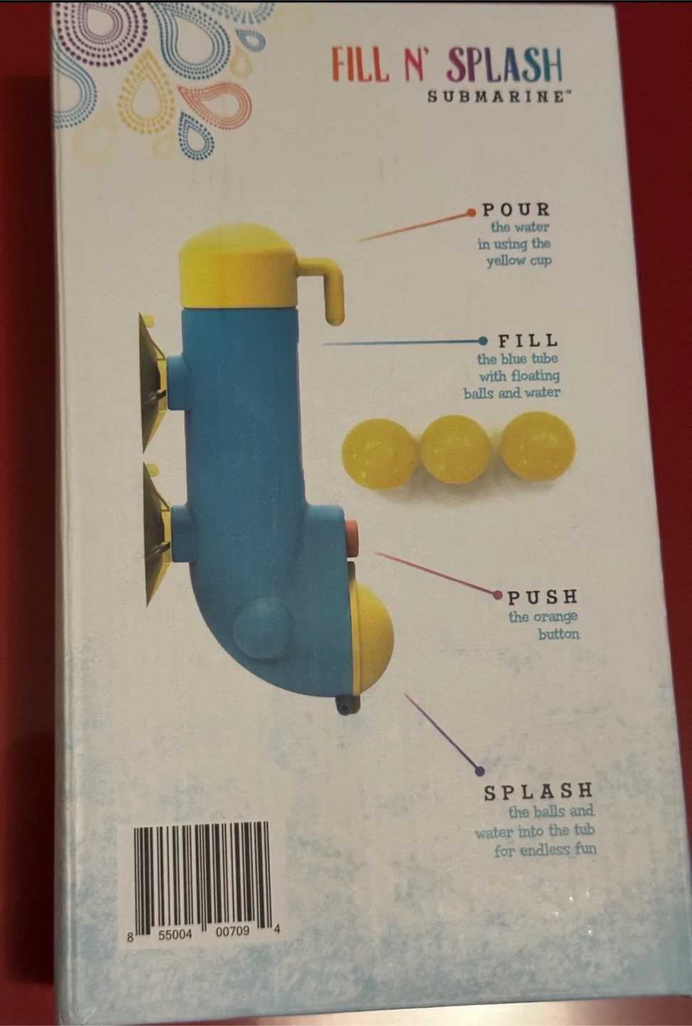 Fill N' Splash Submarine toy is ready for a new home! It includes the Fill N' Splash Submarine, a submarine cup, and a set of 3 floating balls. Recommended for ages 18 months plus. New in the original box!