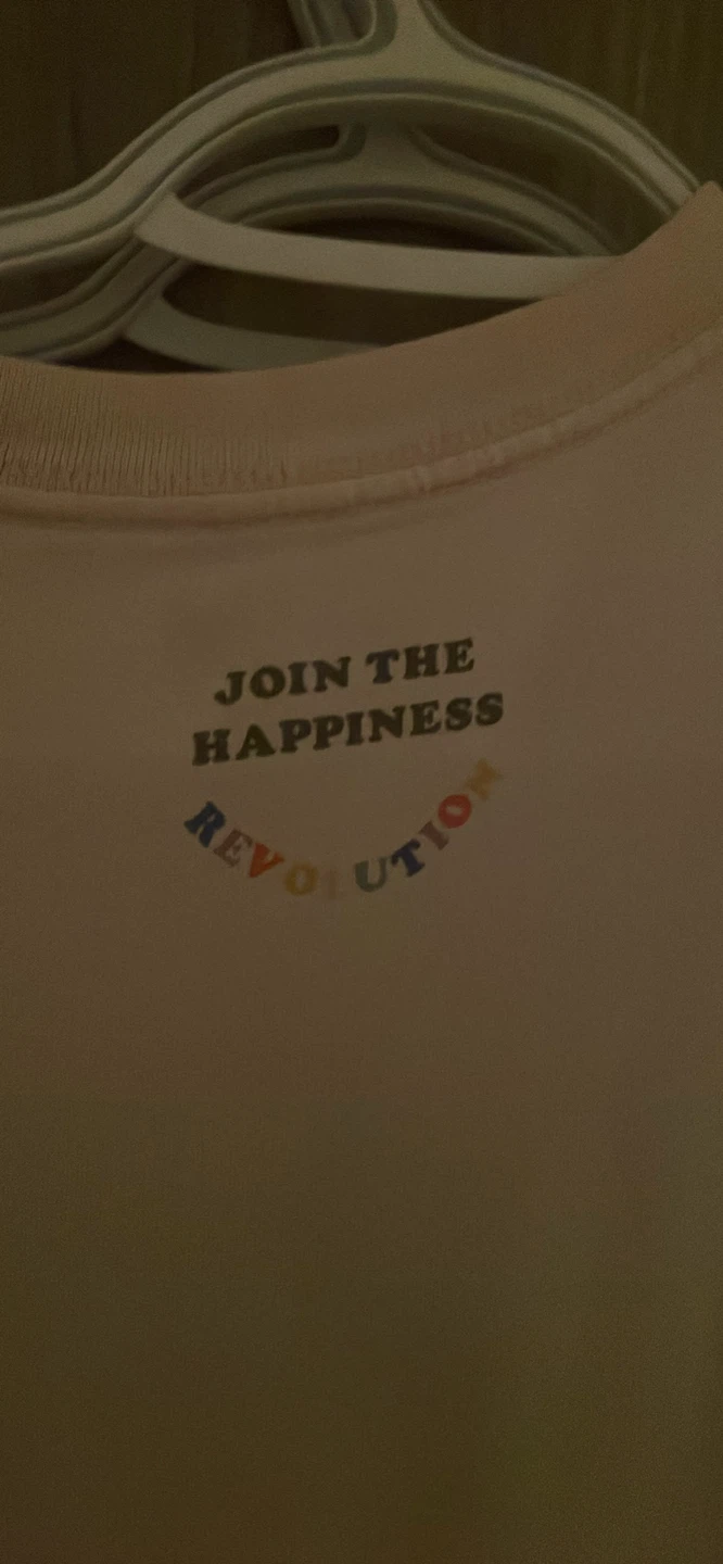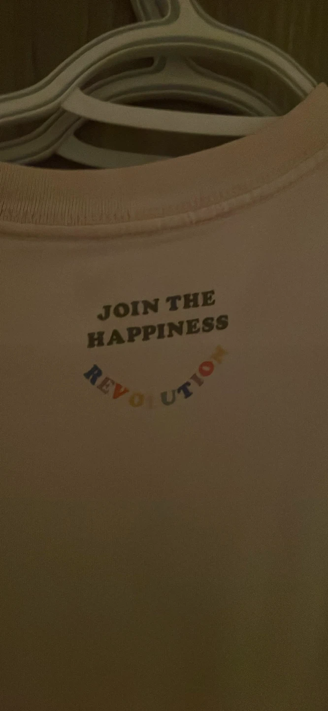 I'm selling a Peanuts t-shirt with the design 'In This Together'. The back of the shirt says 'Join the Happiness Revolution'.
