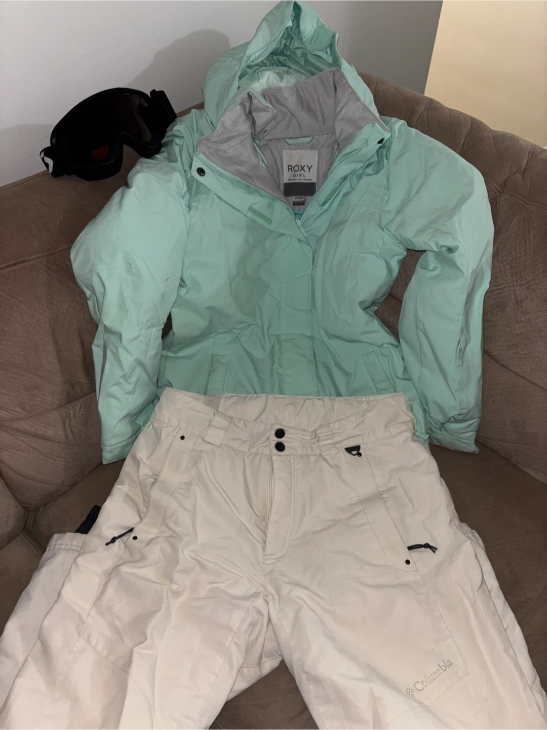 Selling a Roxy Girl snow jacket and Columbia snow pants. The jacket is a light mint green and the pants are off-white. Great for hitting the slopes this winter!