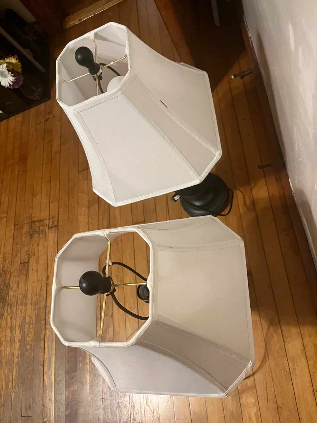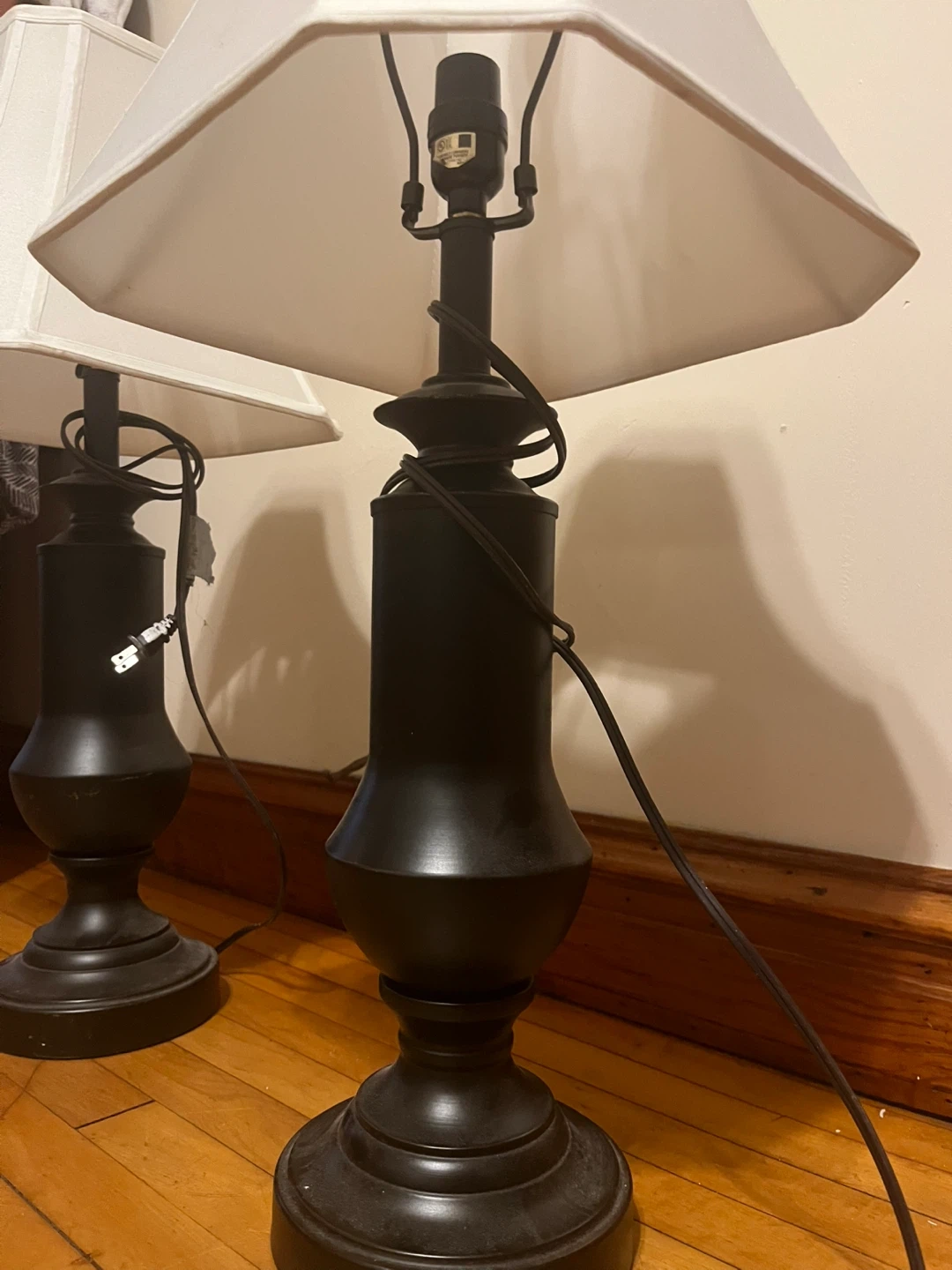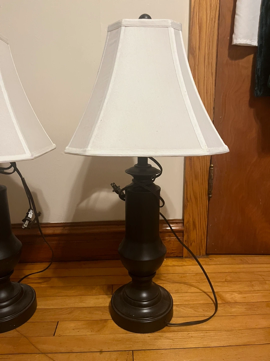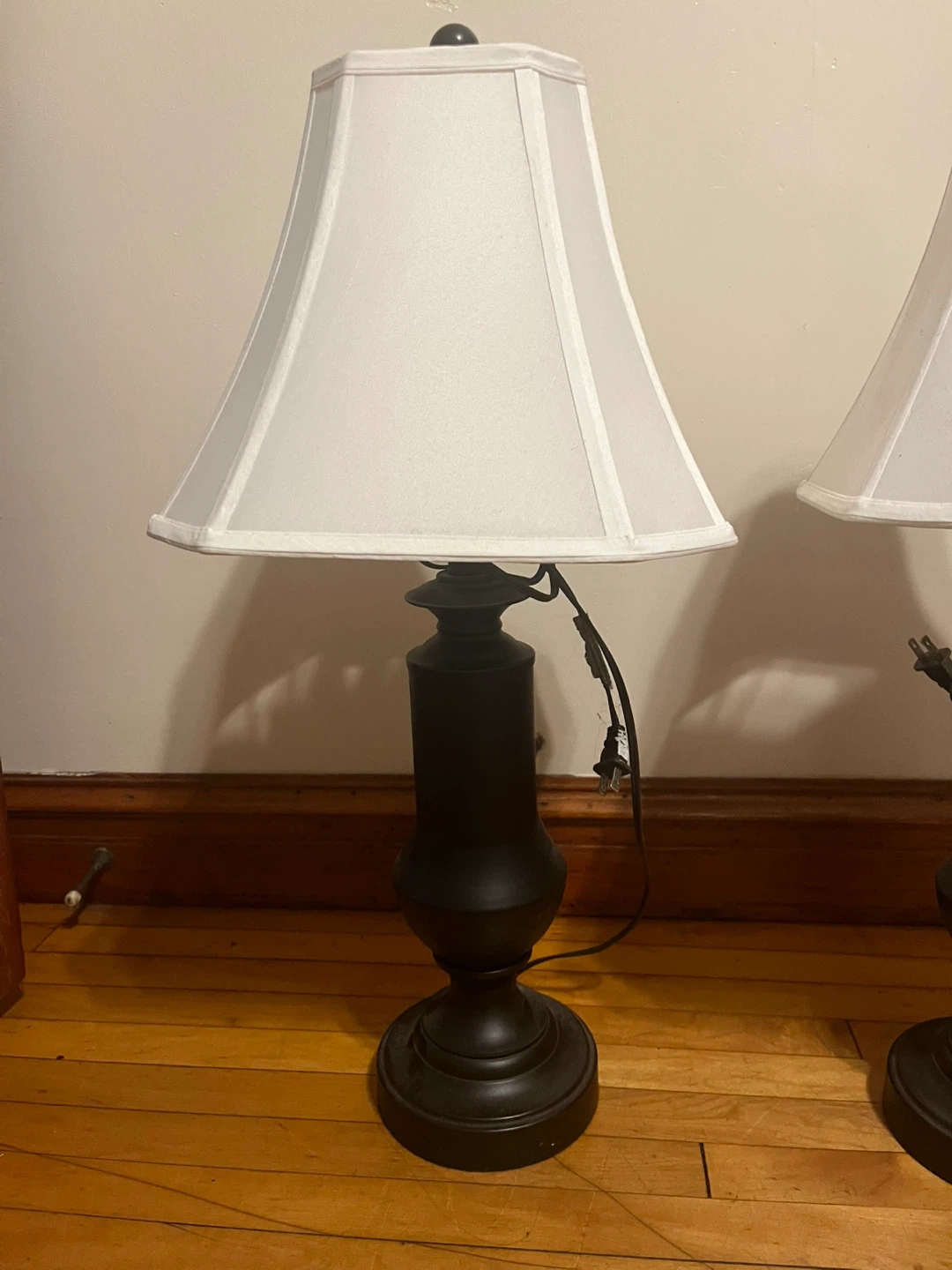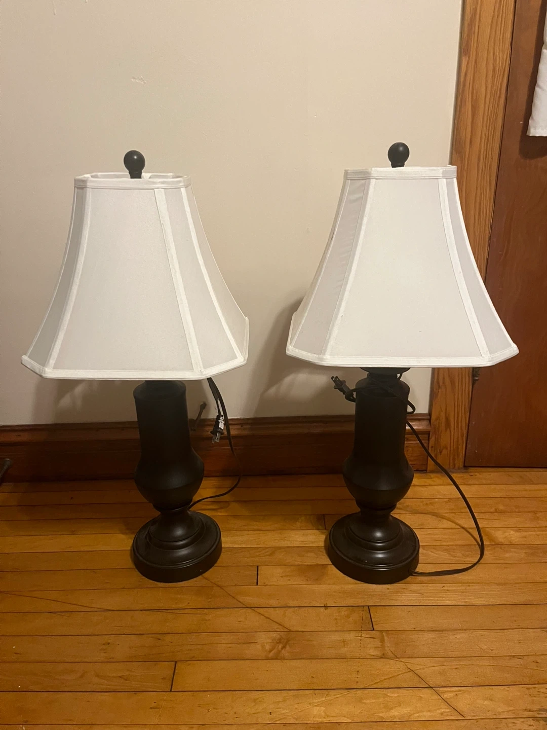 Selling a set of two table lamps. They feature a black base and a white lampshade. Perfect for adding a touch of elegance to any room!