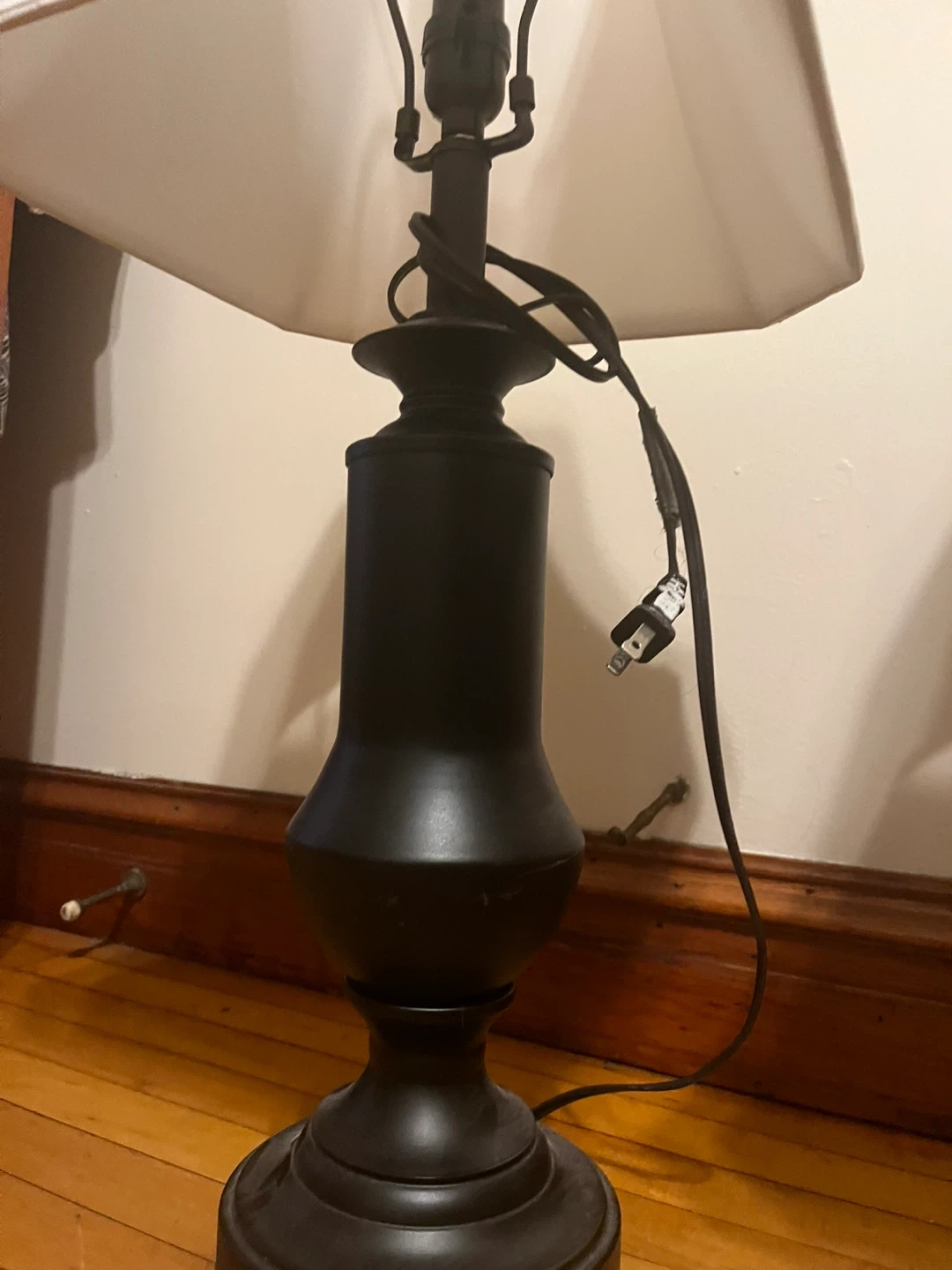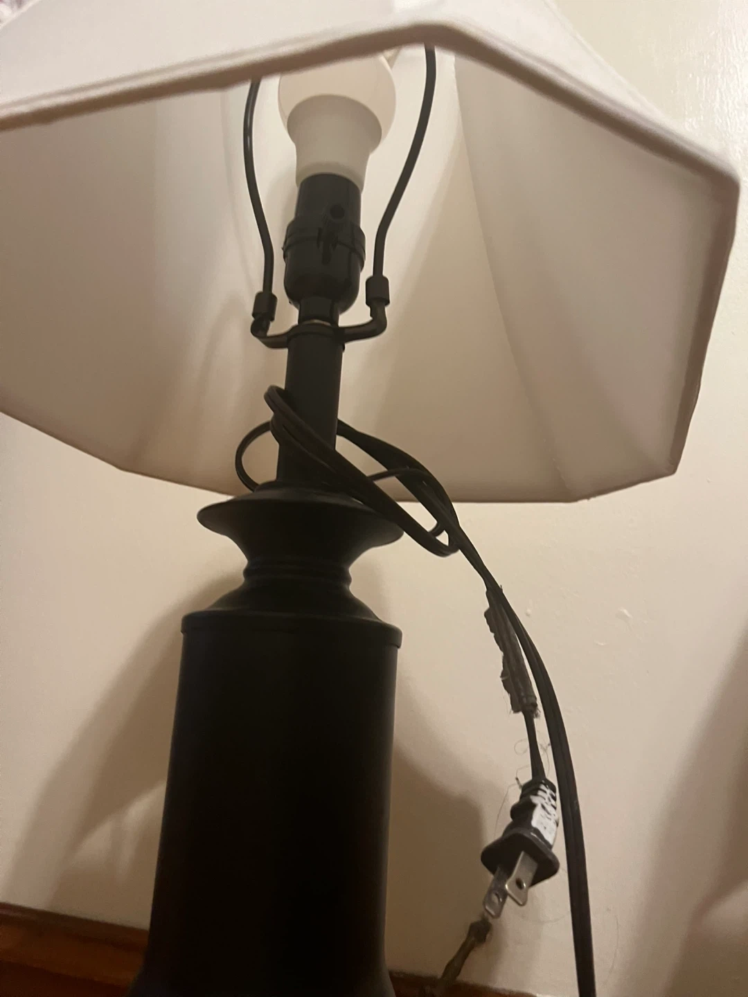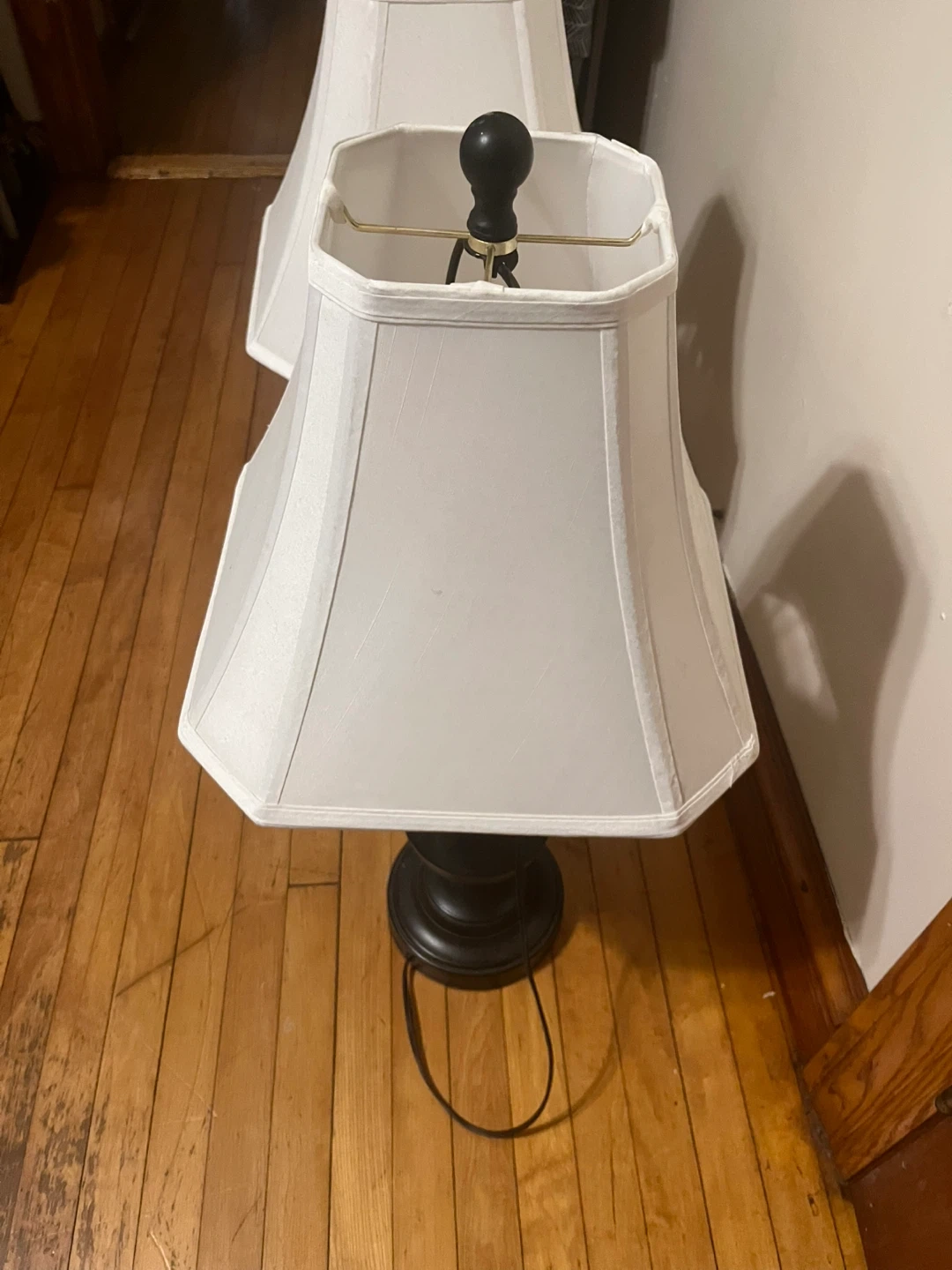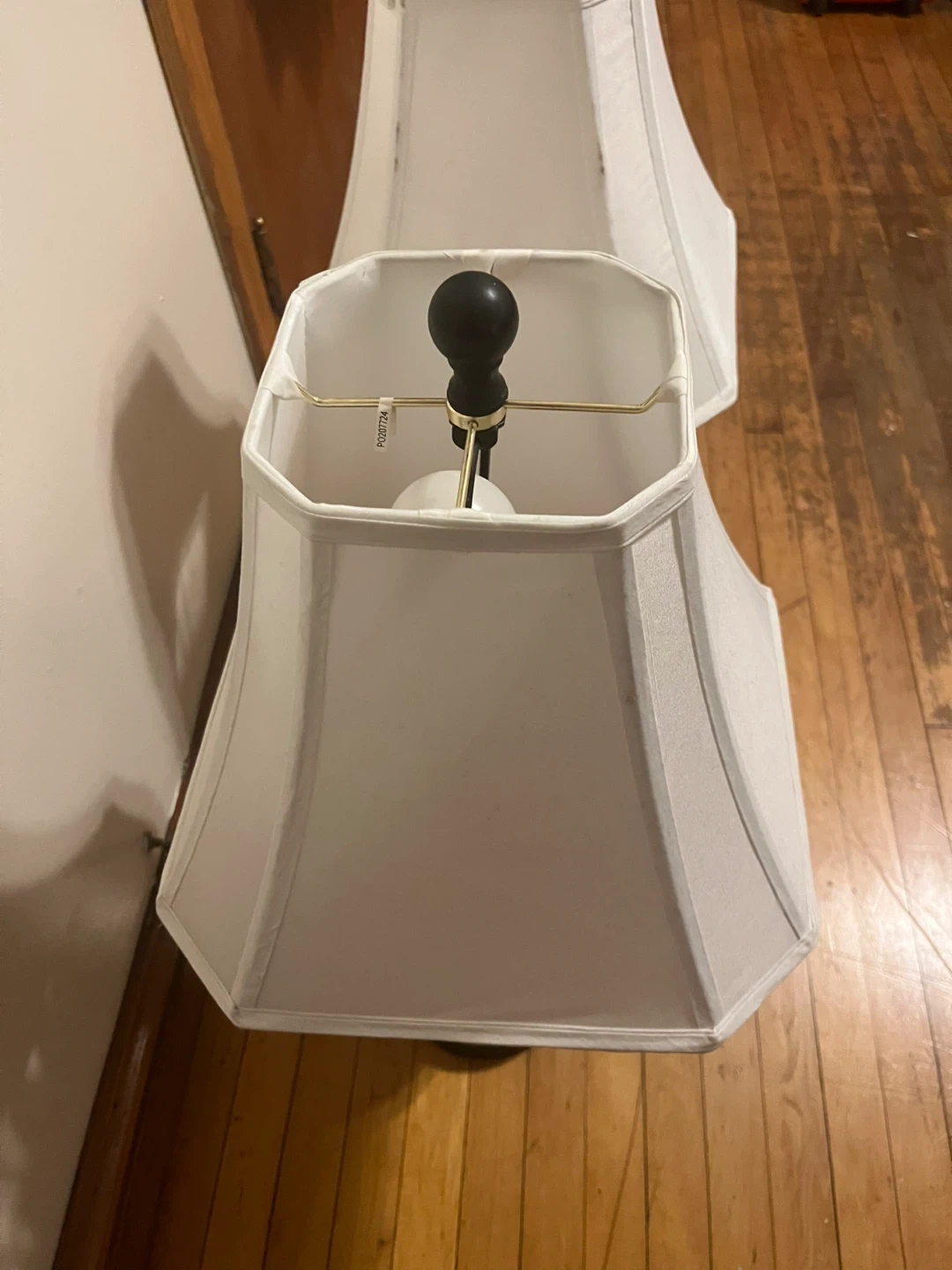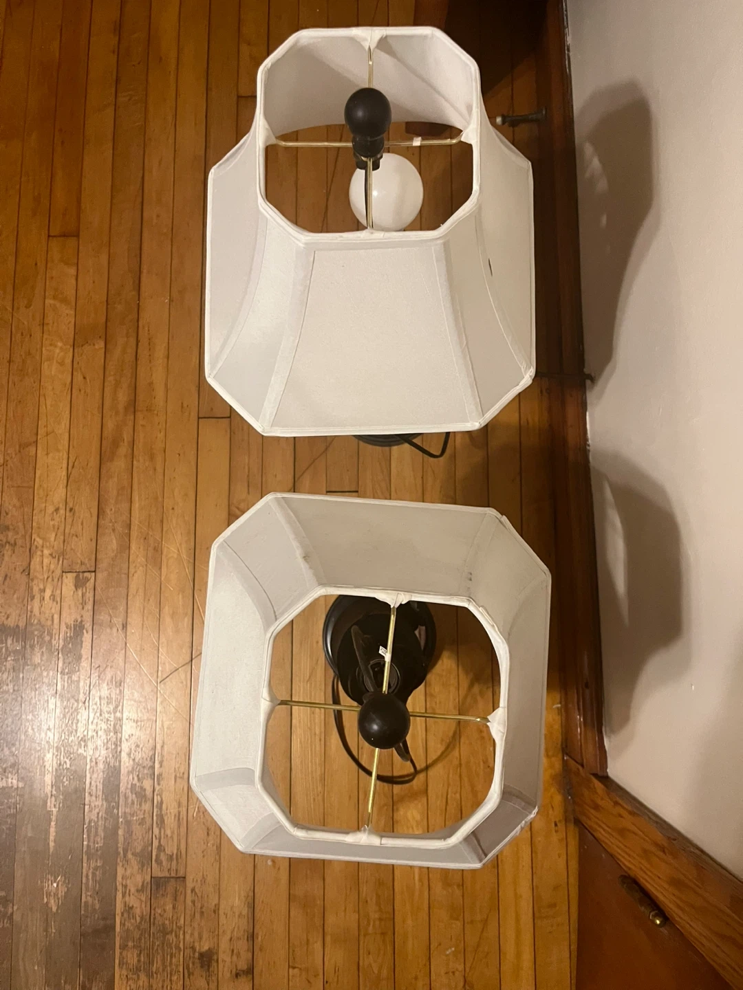 Selling a set of two table lamps. They feature a black base and a white lampshade. Perfect for adding a touch of elegance to any room!
