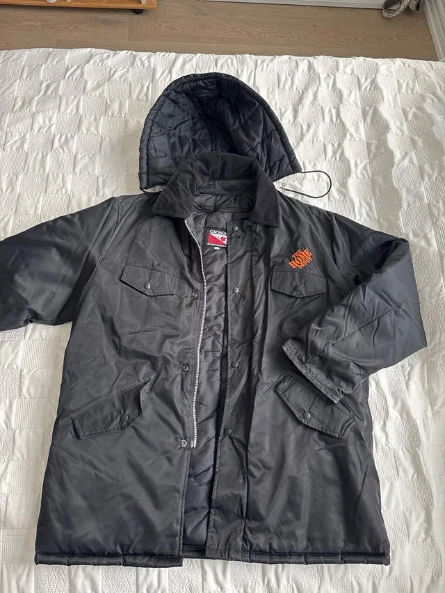 Stay warm this winter with this insulated Home Depot branded jacket. It’s in excellent, almost new condition, no rips or stains. Very warm, durable, and perfect for outdoor work, construction, or everyday wear. Size: Large. Removable hood. Multiple pockets. Heavy-duty but light weight, insulated, and wind-resistant.