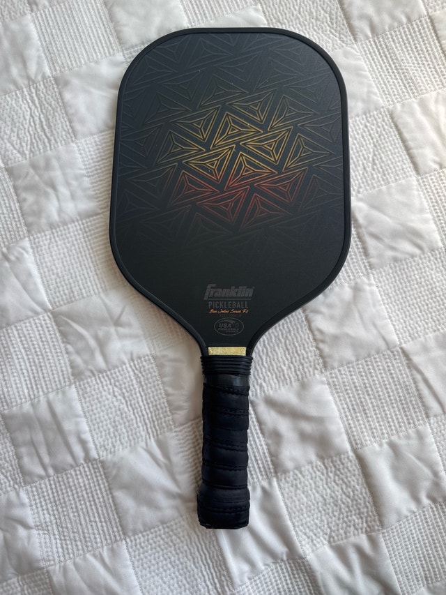 Used Franklin “Ben Johns Series F2 carbon fiber surfaced paddle with a polypropylene core — geared for performance (speed, agility, some power) while being durable and approved for tournament play. Specification Face / Surface Carbon fiber Core Polypropylene Weight ~ 7.0 ‒ 7.4 ounces Dimensions ~ 15.7 in × 7.7 in (length × width) Handle length ~ 4.8 in Core thickness ~ 11 mm Certification USAPA approved