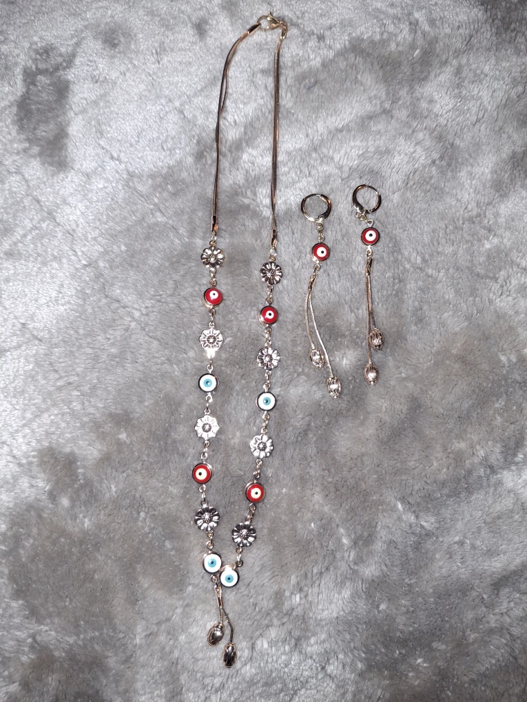 Selling a cute necklace and earrings set. The necklace has a delicate chain with flower and evil eye beads. The earrings match the necklace with a similar design. They are in great condition and ready to add a touch of charm to your style