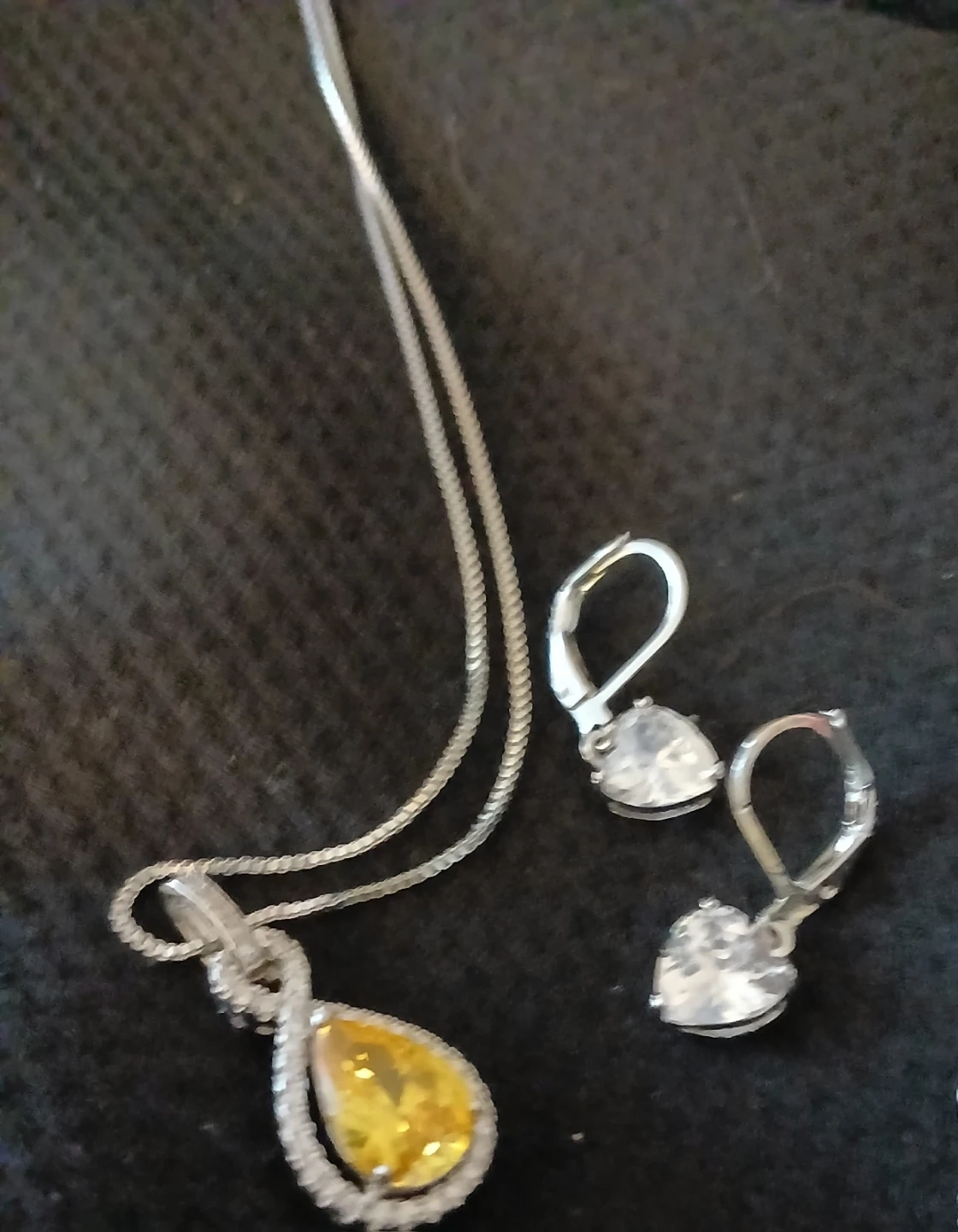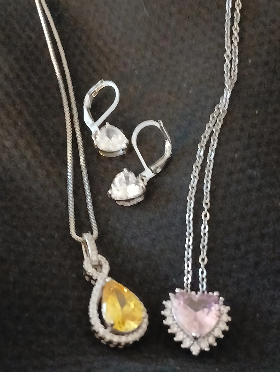 Selling a set of necklaces and earrings. The set includes two necklaces, one with a yellow pendant and one with a pink heart pendant, and a pair of matching earrings. They're in great condition!
