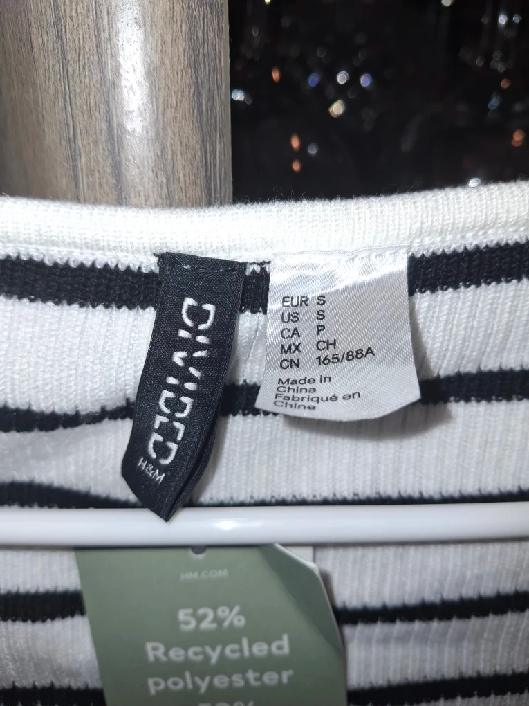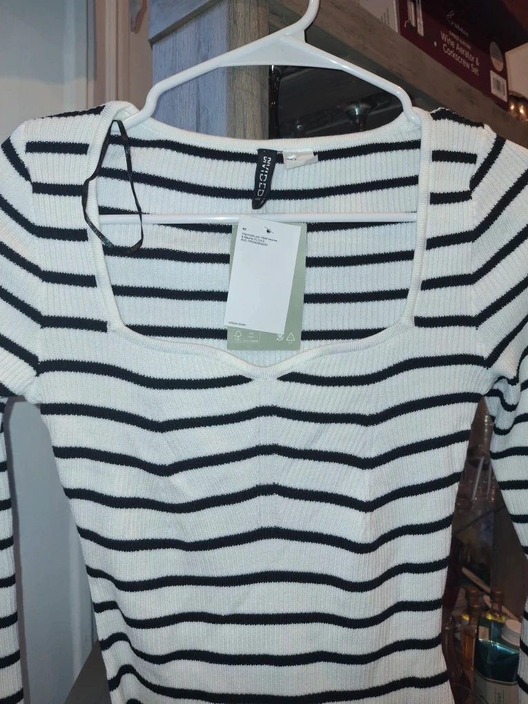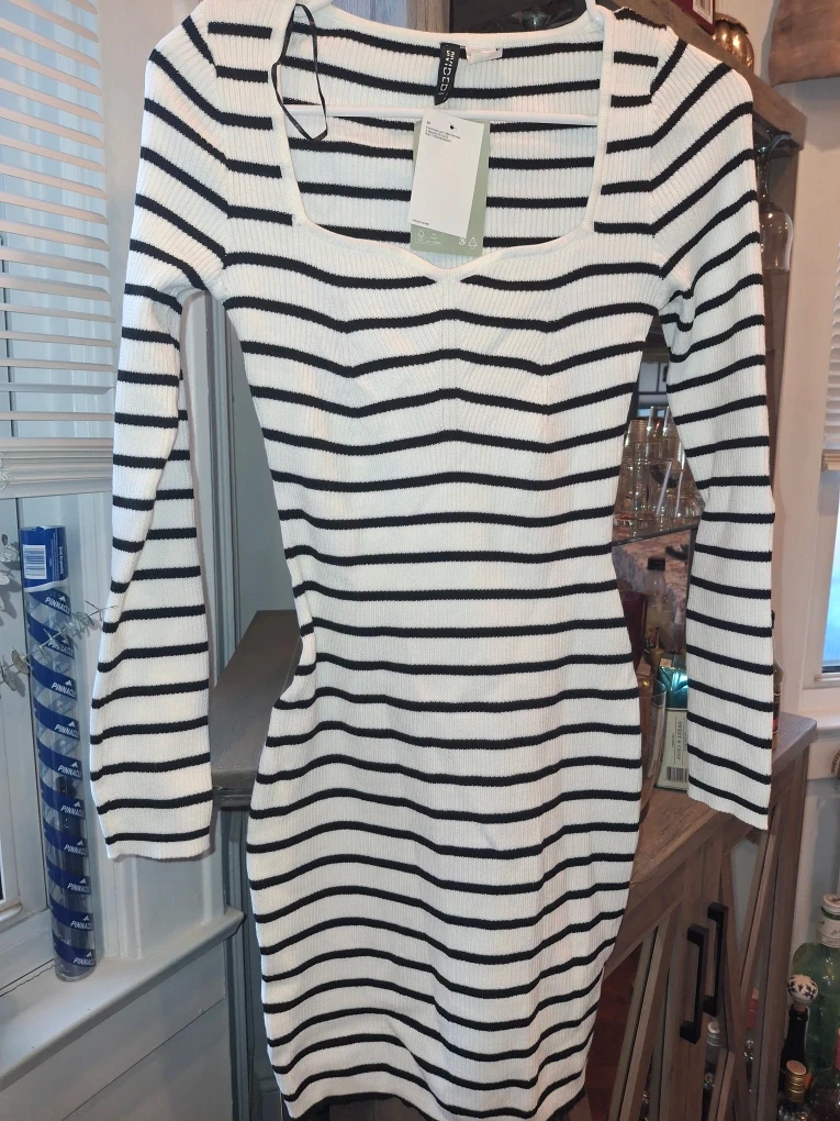 Selling a cute H&M Divided striped dress! It's a size small and made of 52% recycled polyester. The dress features a stylish square neckline and long sleeves. Perfect for a casual day out!