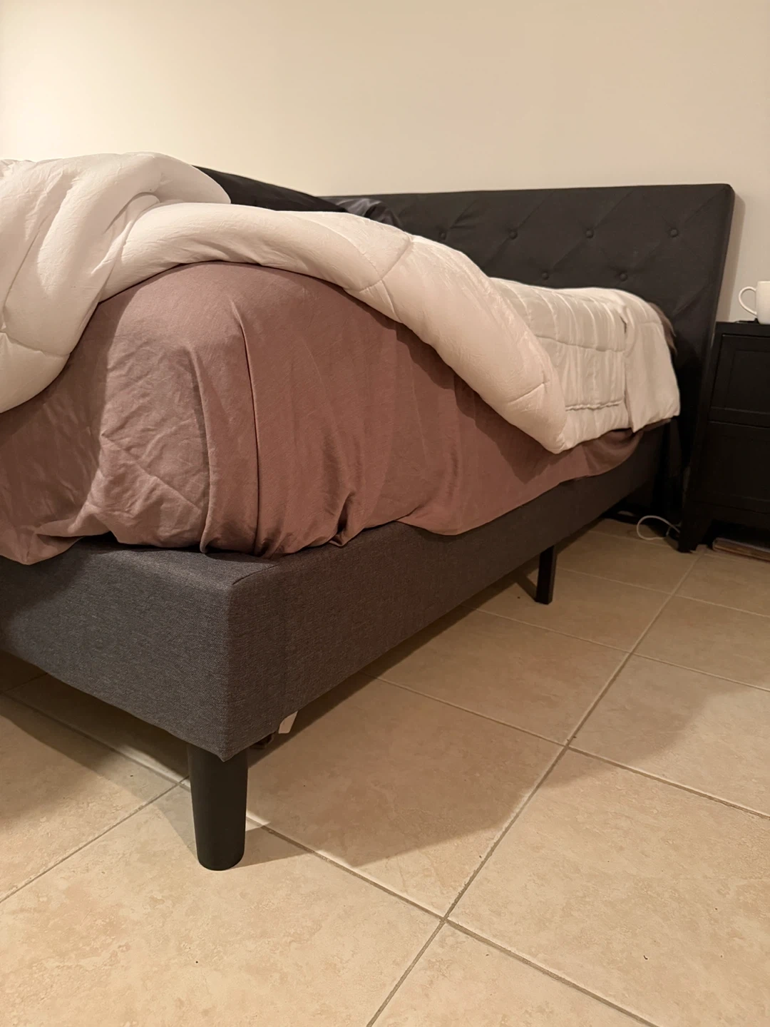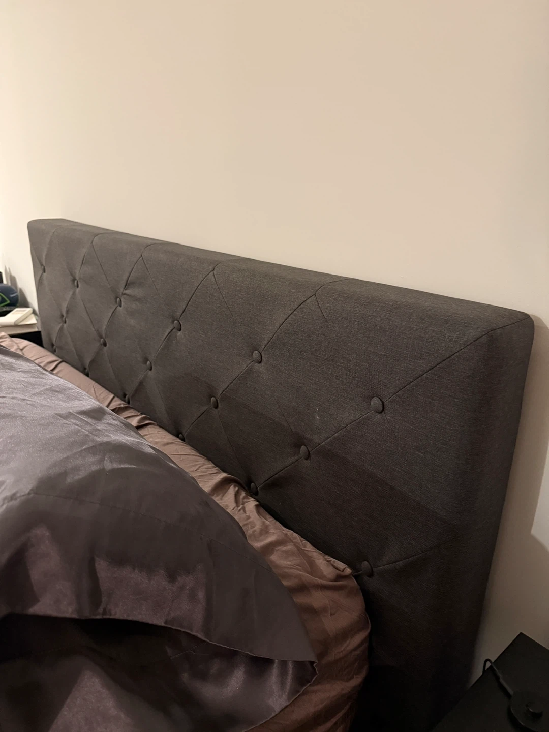 Selling a gray tufted upholstered queen bed frame. It's in great condition and would be a stylish addition to any bedroom.