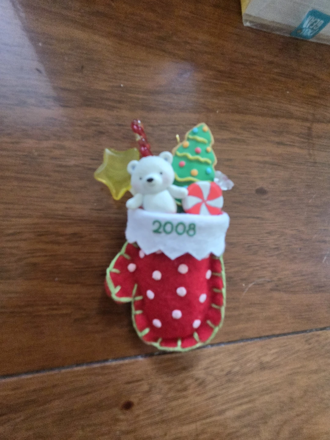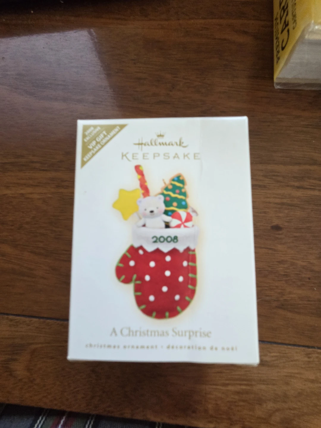 Selling a Hallmark Keepsake ornament called "A Christmas Surprise"! It's a cute little mitten filled with a teddy bear, Christmas tree, and candy. The ornament is dated 2008. It's in excellent condition and comes with the original box