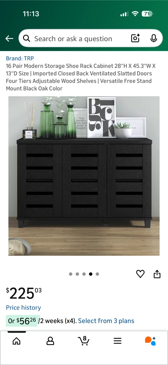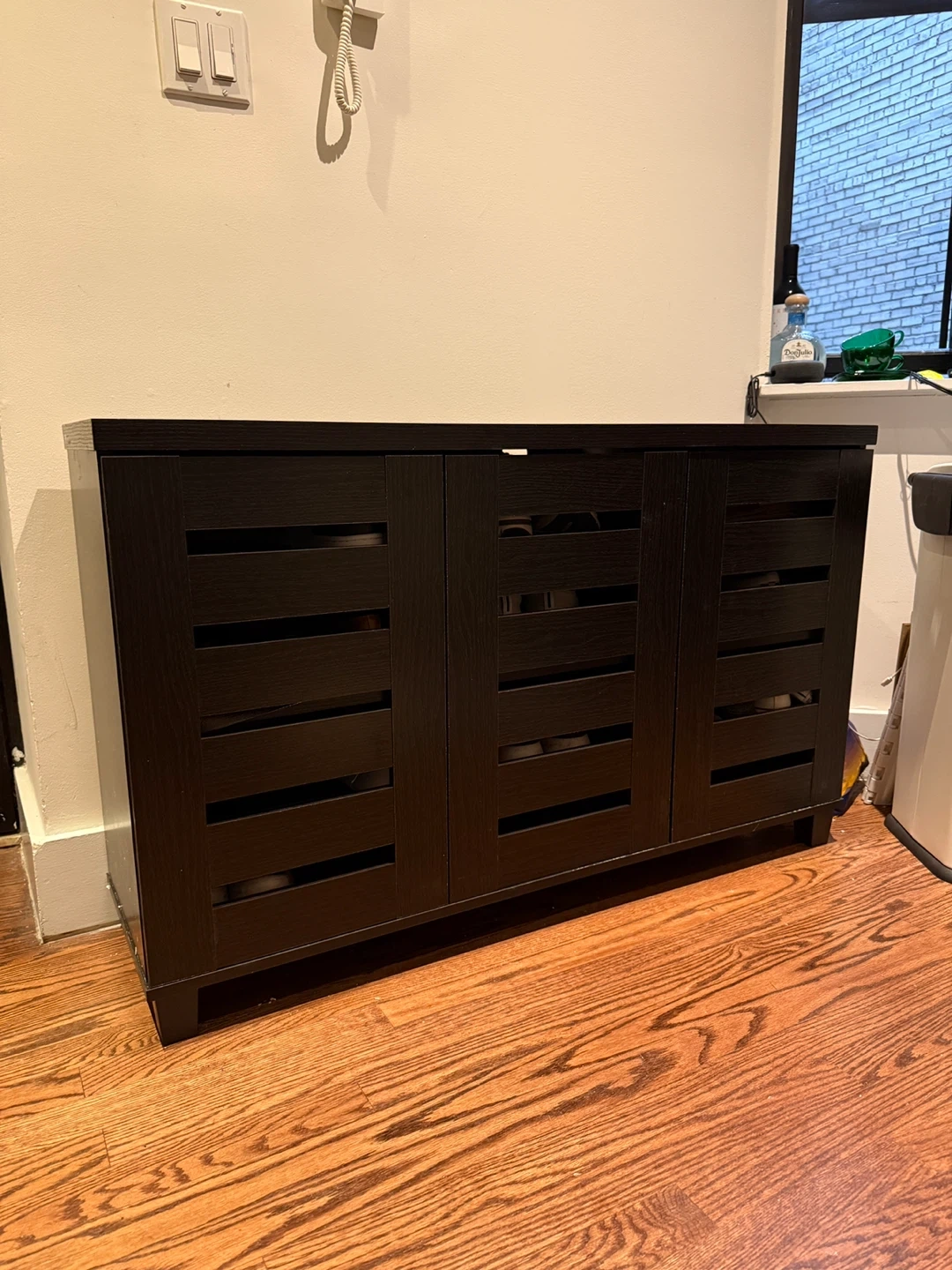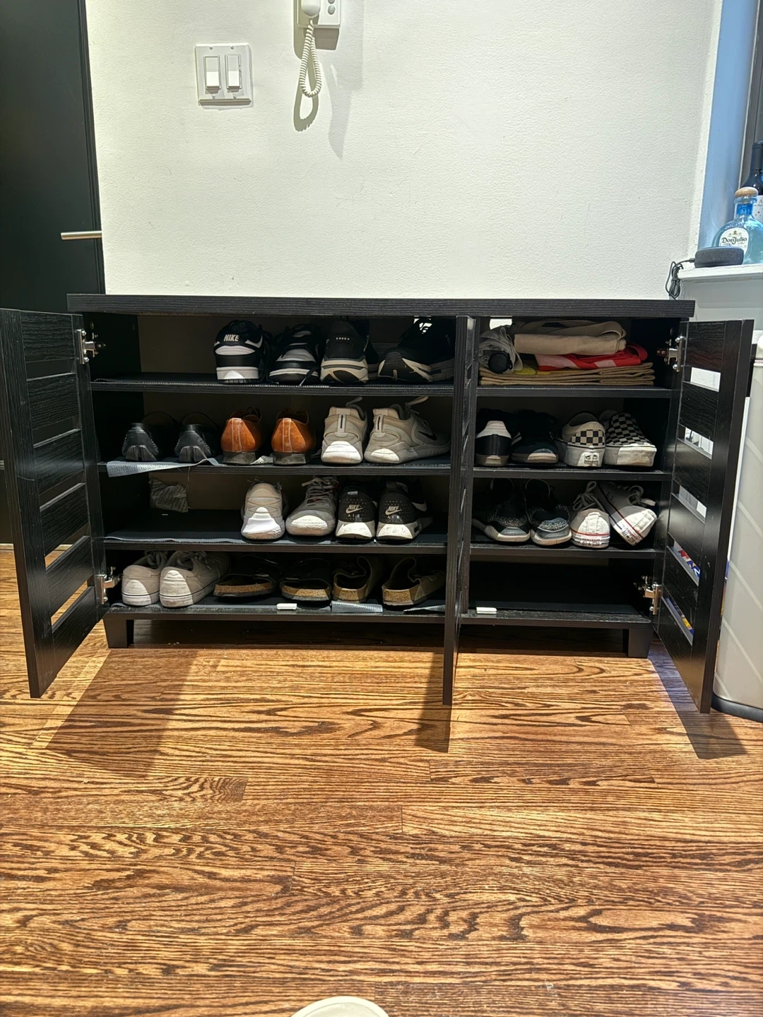 Modern Storage Shoe Rack Cabinet 28"'H X 45.3"W X 13"D Size | Imported Closed Back Ventilated Slatted Doors Four Tiers Adjustable Wood Shelves