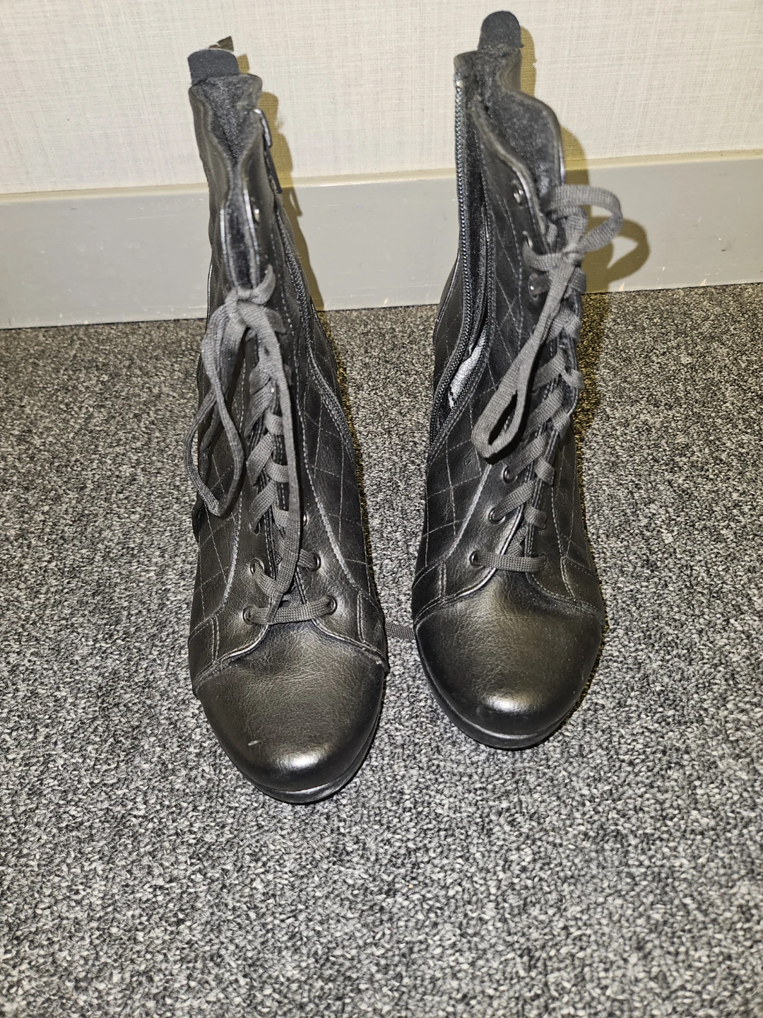 Cute pair of black heeled ankle boots. They feature a quilted design and lace-up front with a side zipper. Great for adding a bit of edge to any outfit!