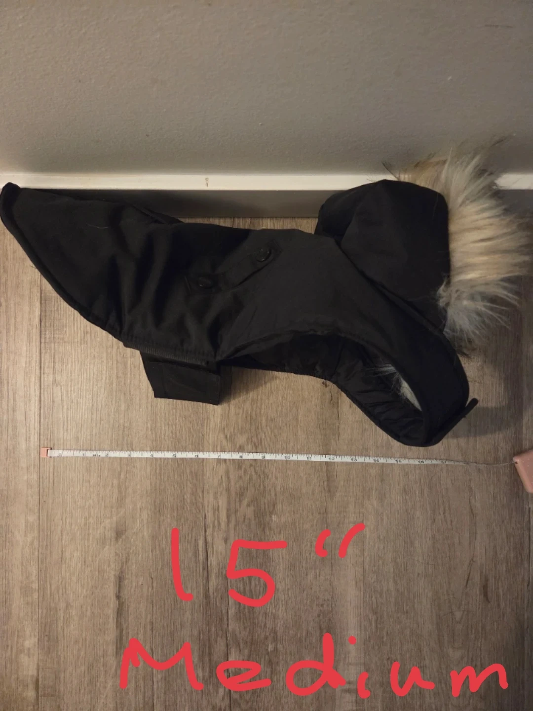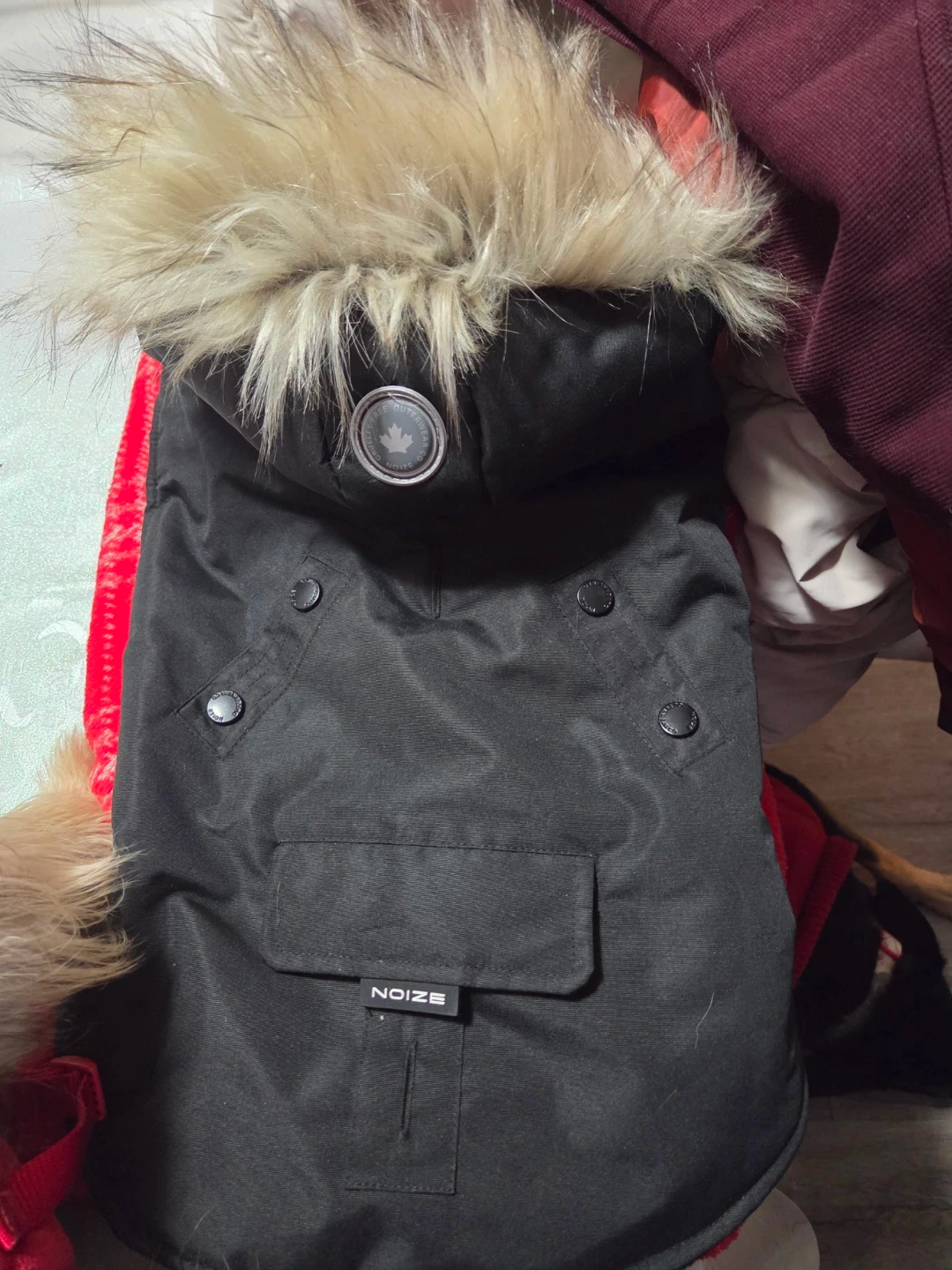 Keep your furry friend warm with this stylish black dog coat from NOIZE! It's a size medium and measures about 15 inches. Perfect for those chilly Canadian walks!