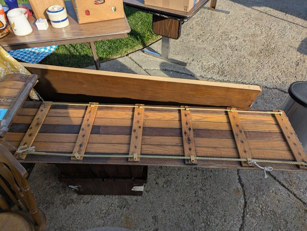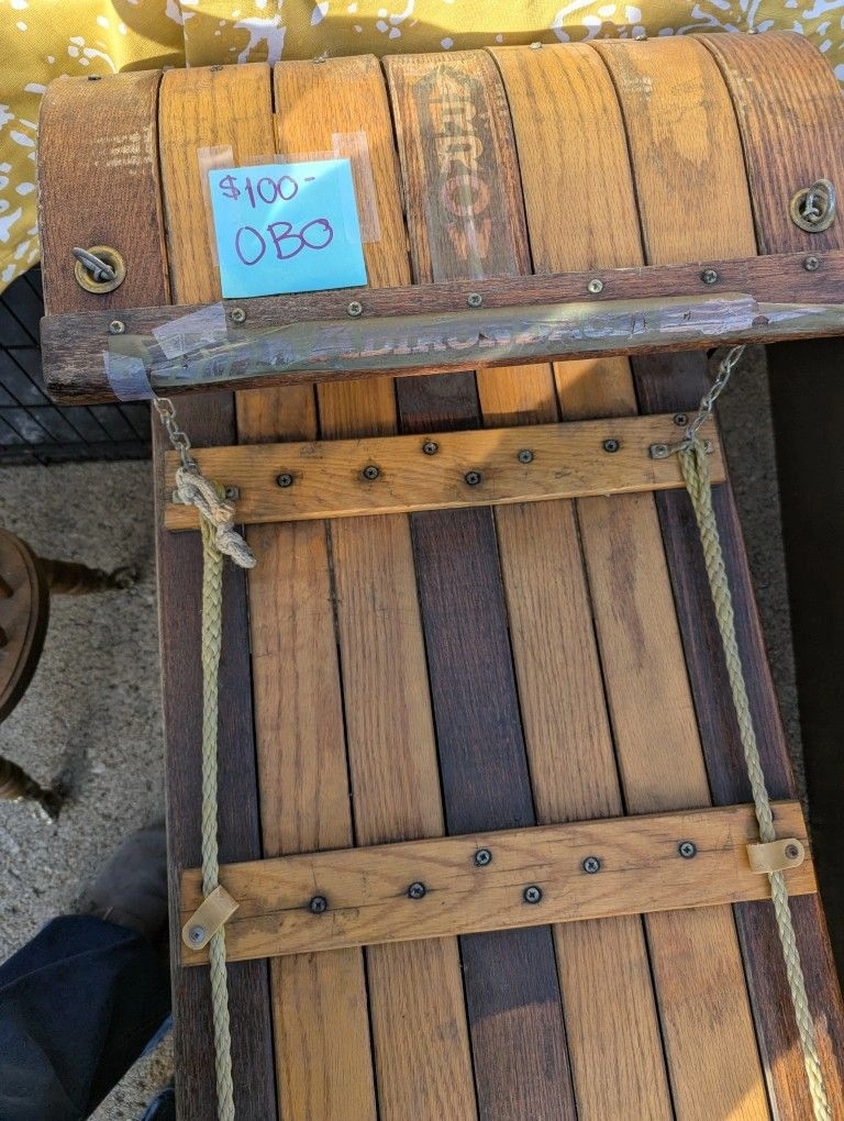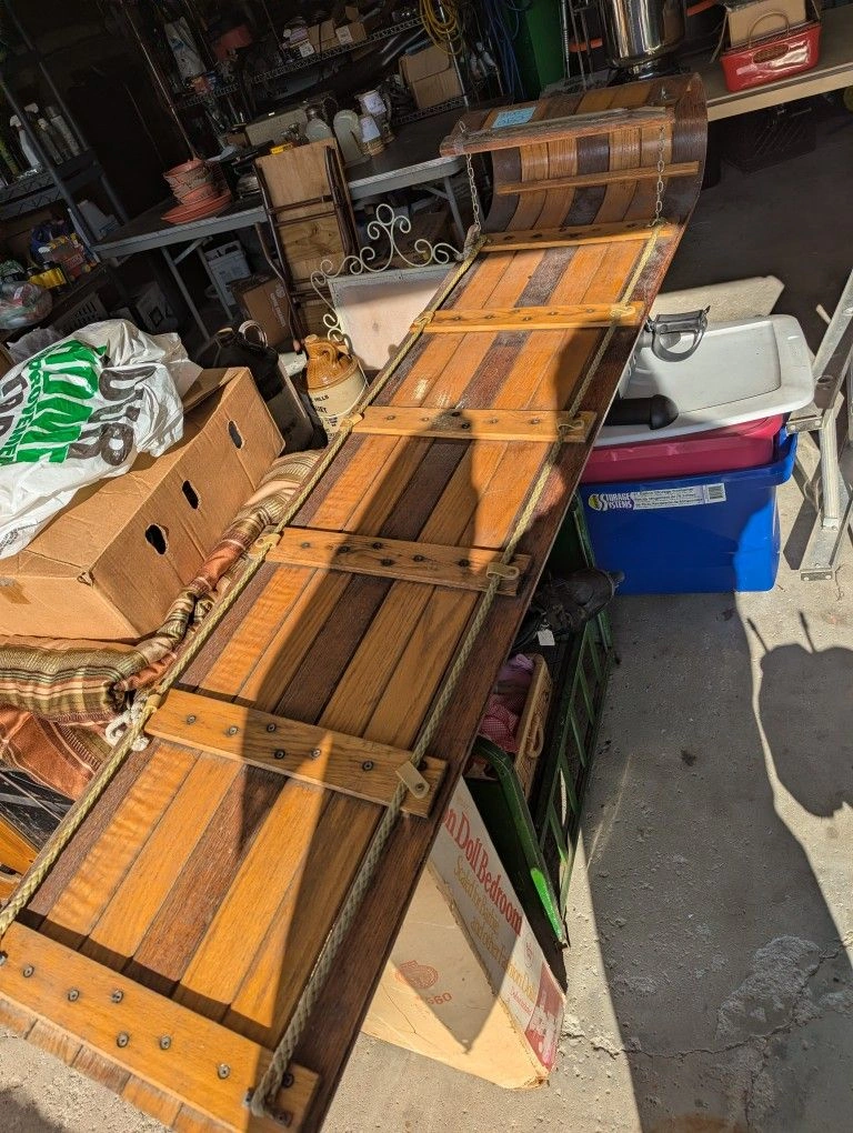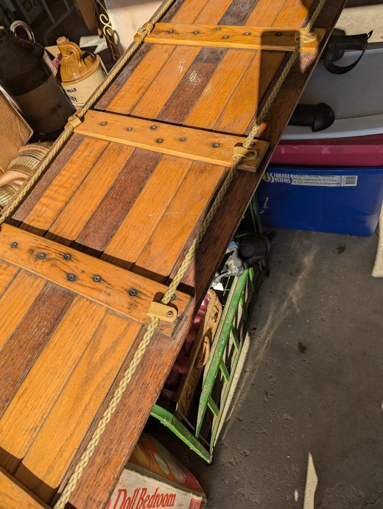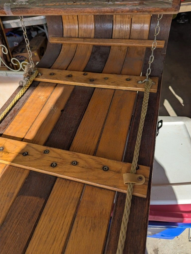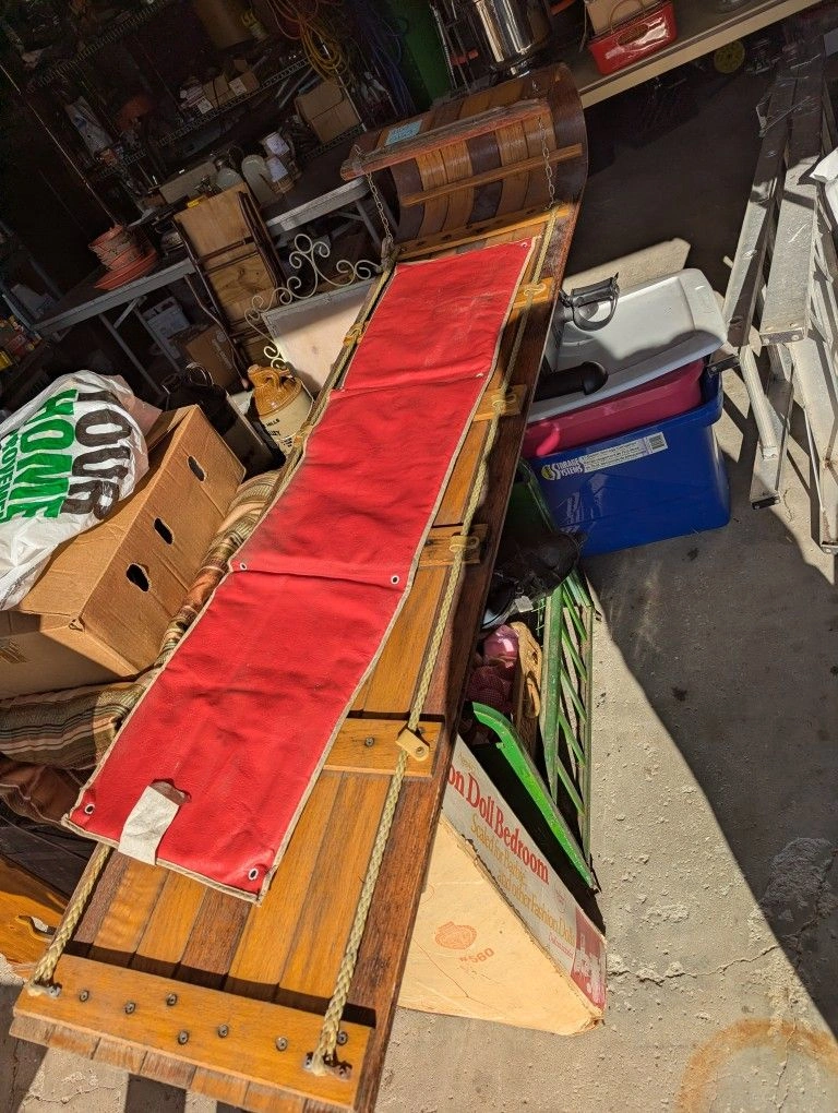 Great condition vintage wooden arrow toboggan sled with red pad.
