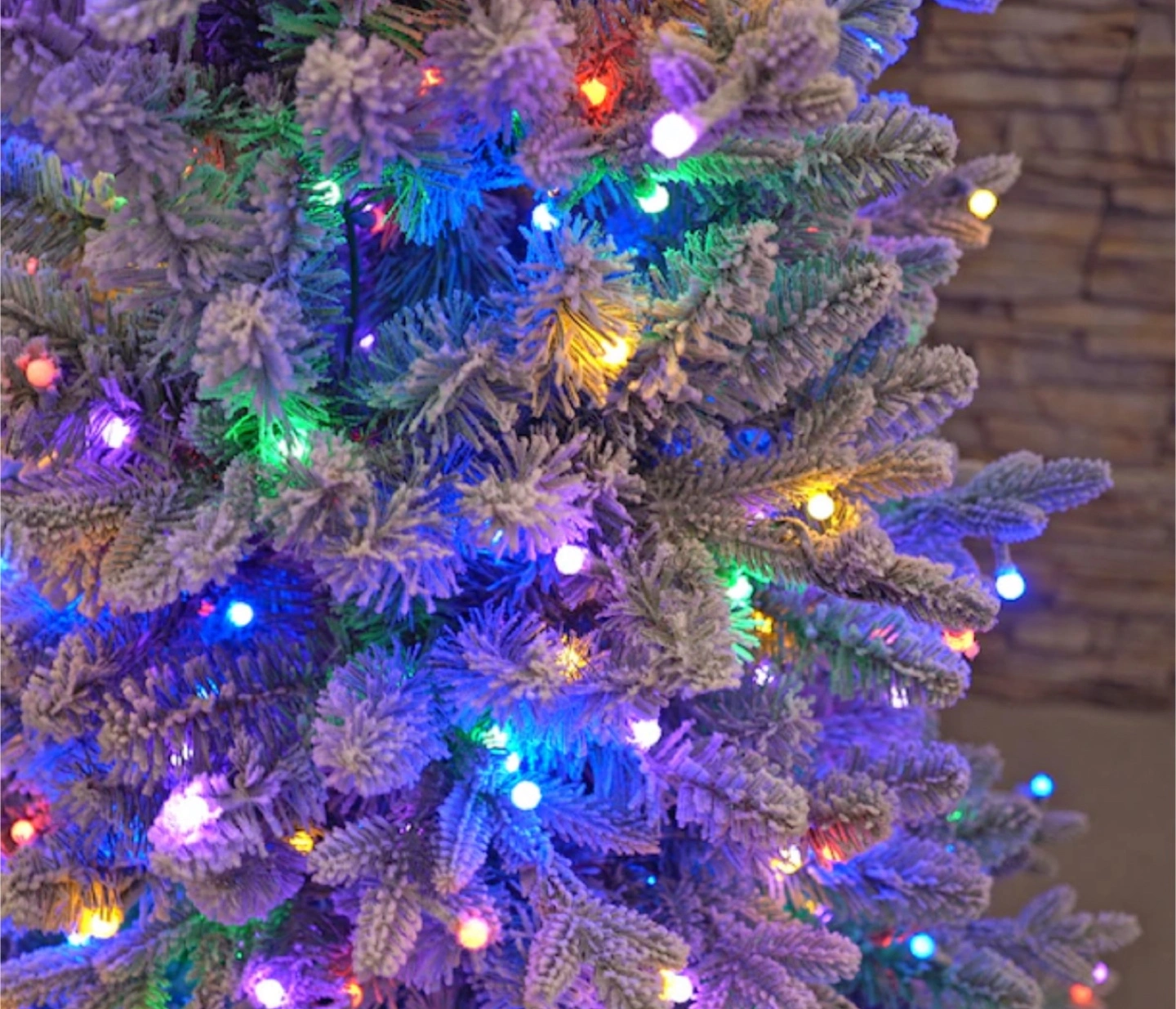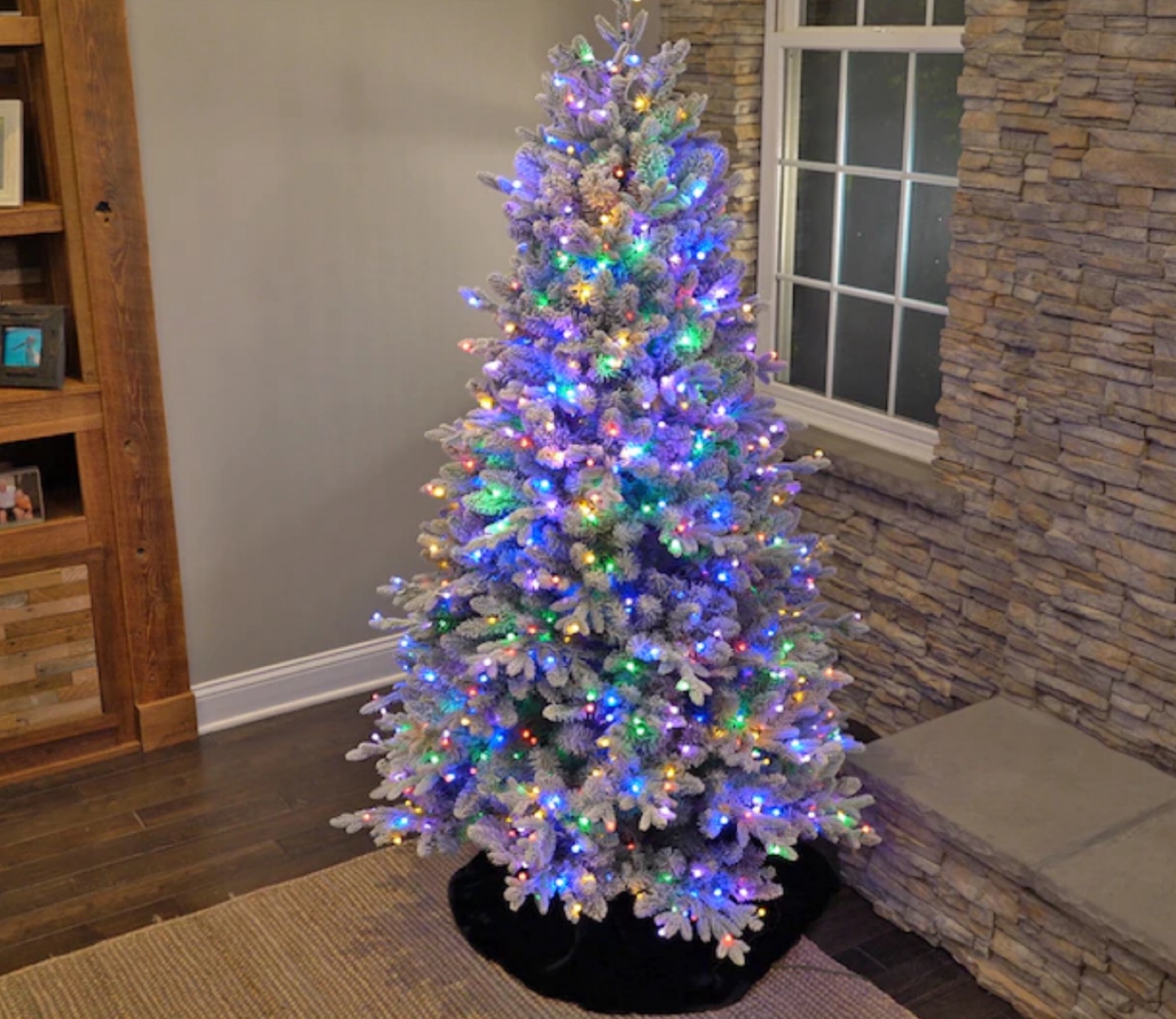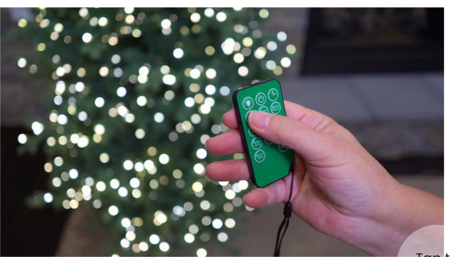 This tree is adorned with 1200 LED colour-changing lights. You don't need to choose between white and multi lights, as you get them with both, with even a pastel option included. There are 11 total functions including a truly magical random twinkle and fast and slow fading options. There are three brightness settings with a timer, and all controllable with an included remote control. It is 46" in diameter.