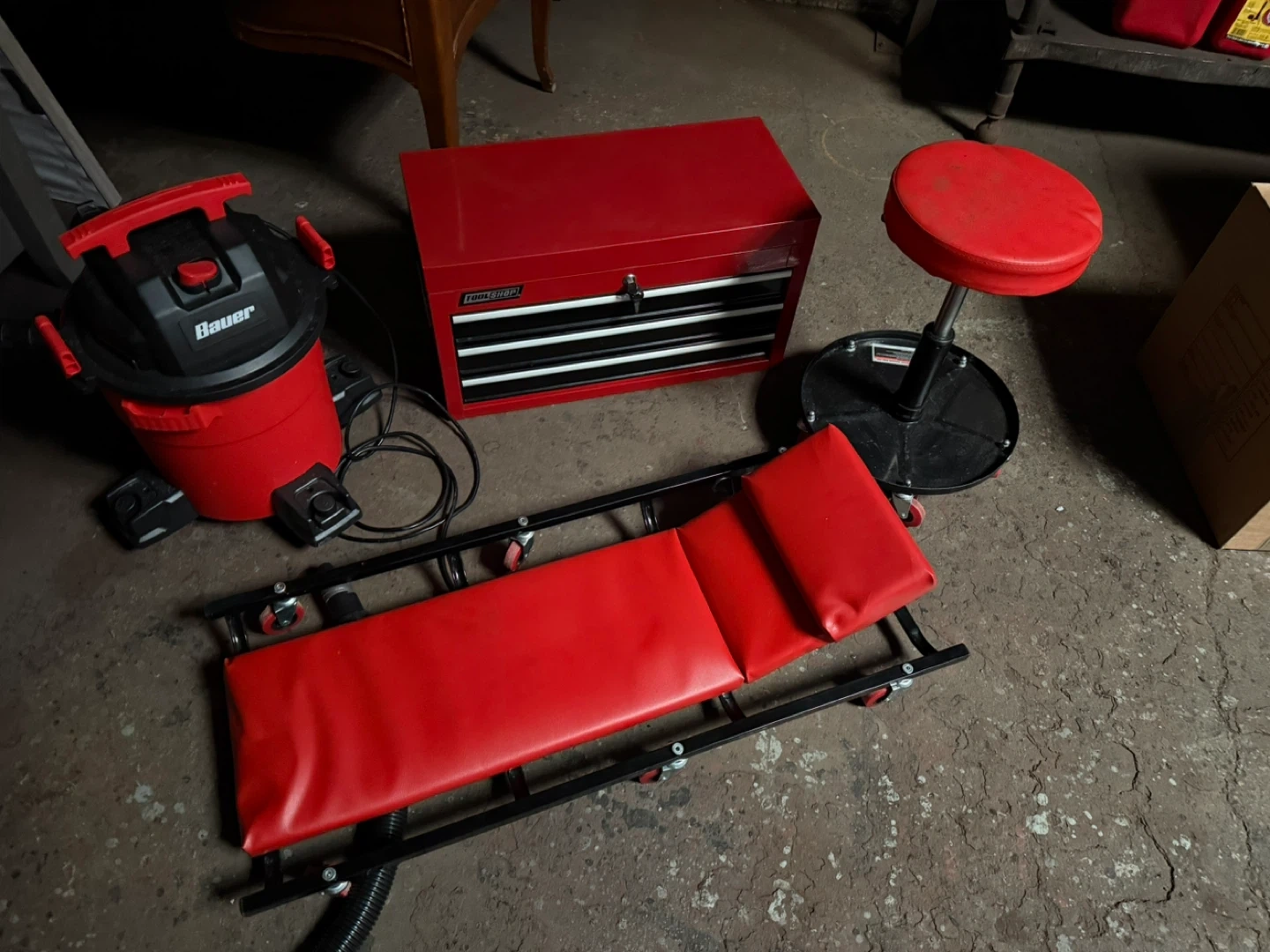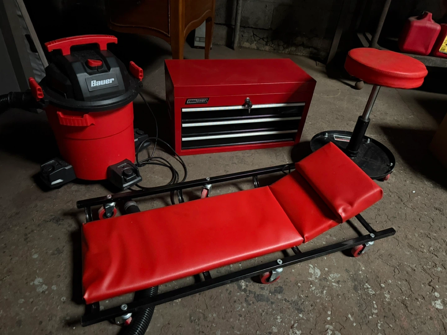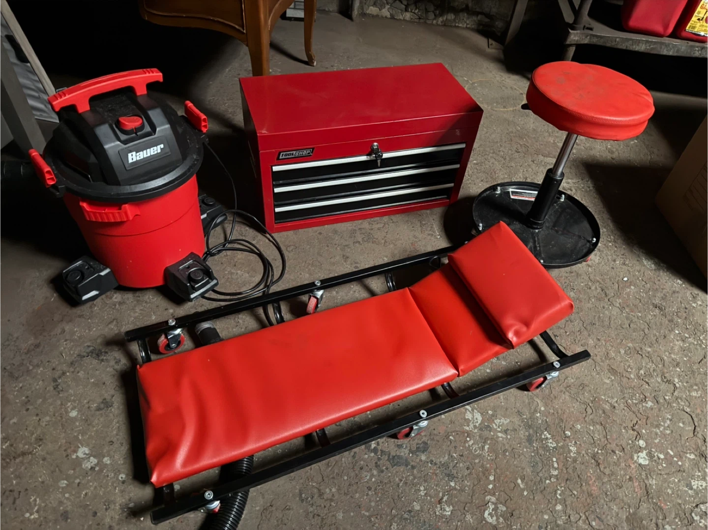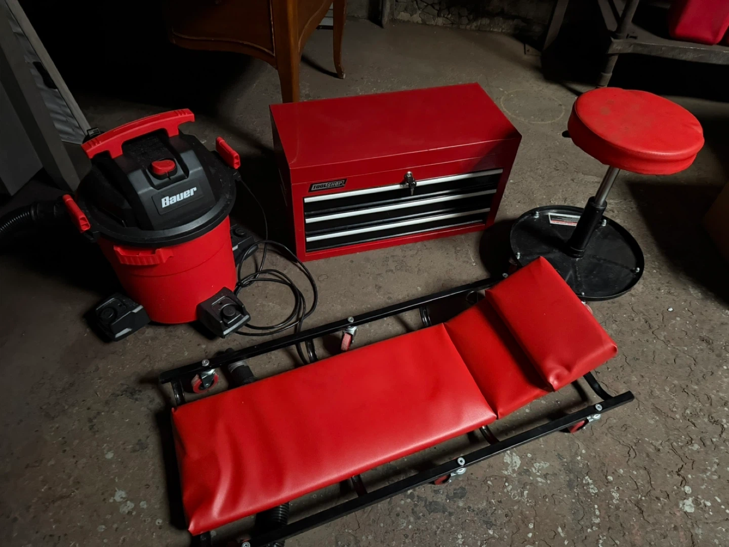 Selling a tool lot including a Tool Shop toolbox, Bauer wet/dry vacuum, mechanic's creeper, and adjustable stool. All items are red and in used condition.