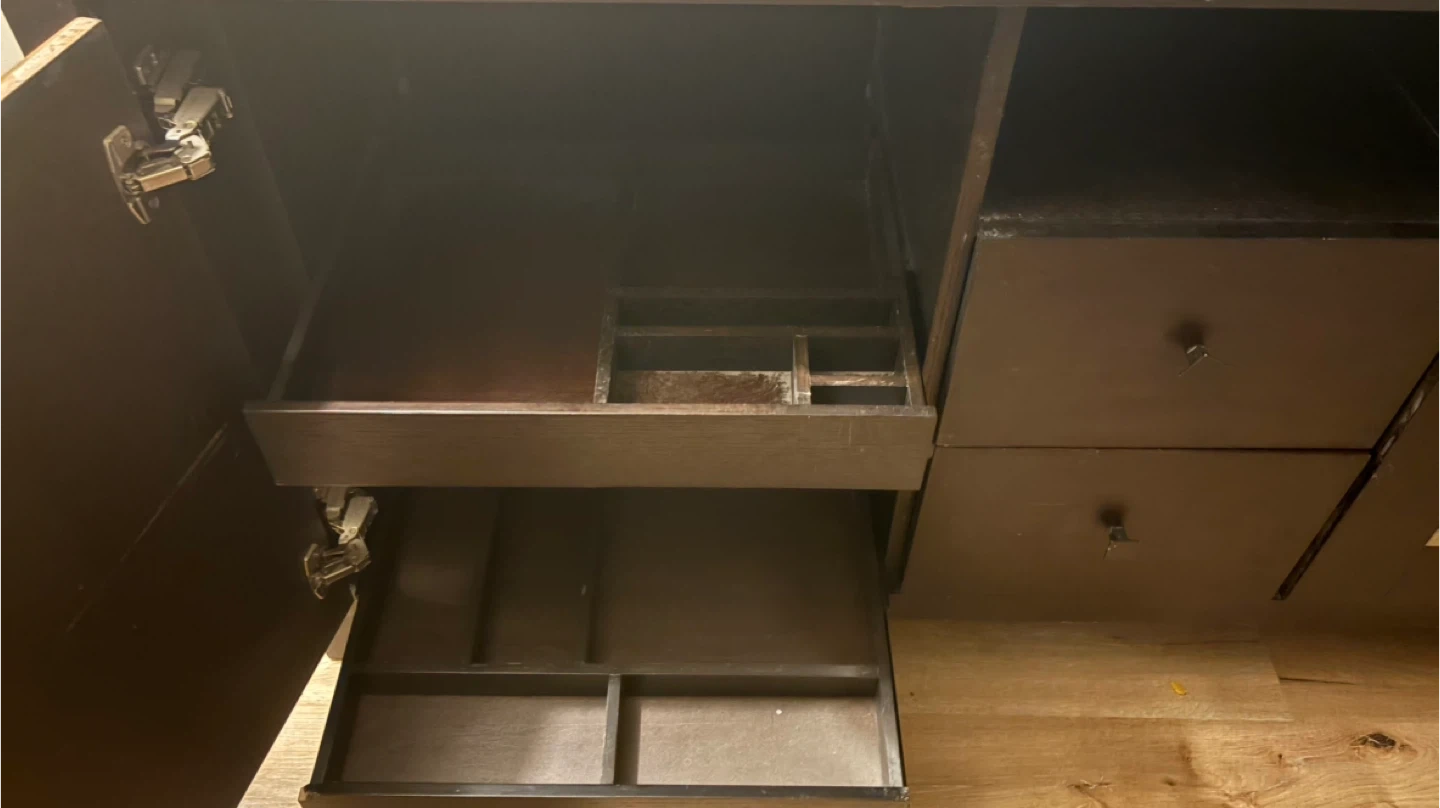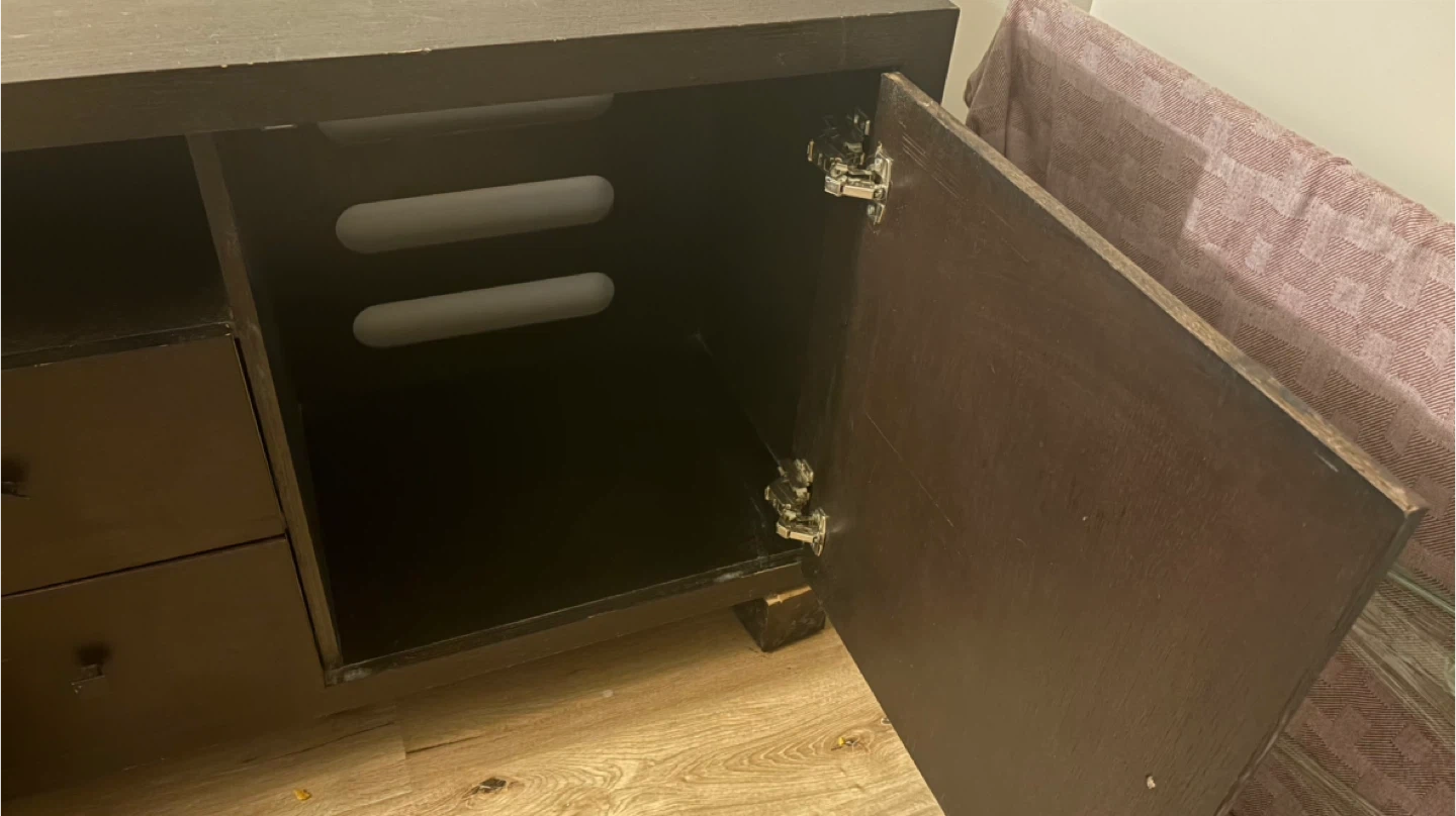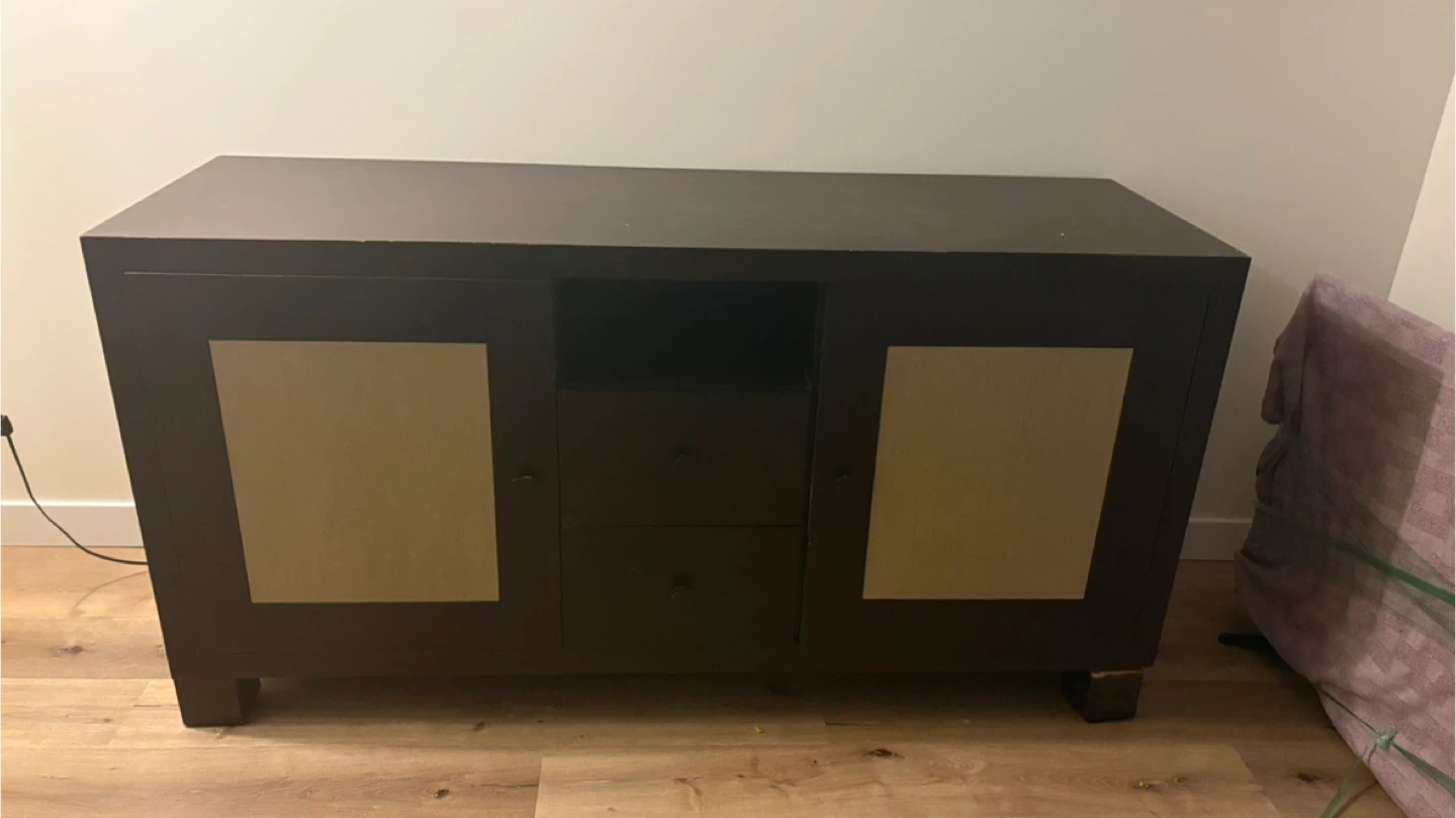 Solid wood cabinet. It has some wear and tear as well as one leg broke off during the move as shown in the photo can be fixed also has a plug in on the inside of the cabinet. features two doors, drawers, and an open shelf for storage. Great for a living room tv stand or dining room sideboard could also make for a great project to refinish the cabinet and make it look more modern. Must bring help with you to move it as it is very heavy well over 300lbs