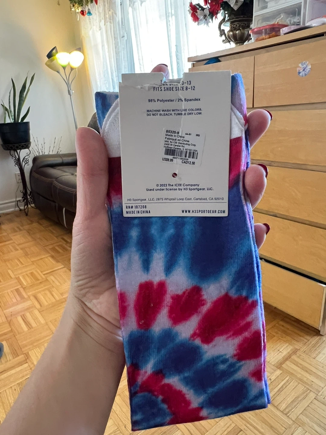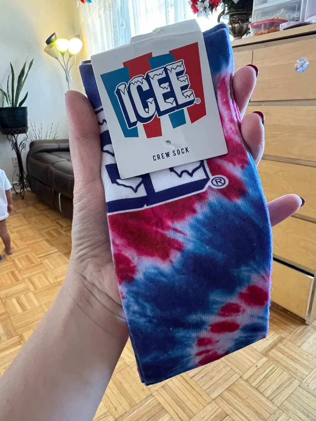 I'm selling a pair of brand new ICEE crew socks! They fit shoe sizes 8-12 and are made of 98% polyester and 2% spandex. The socks have a cool tie-dye design in red, white, and blue.