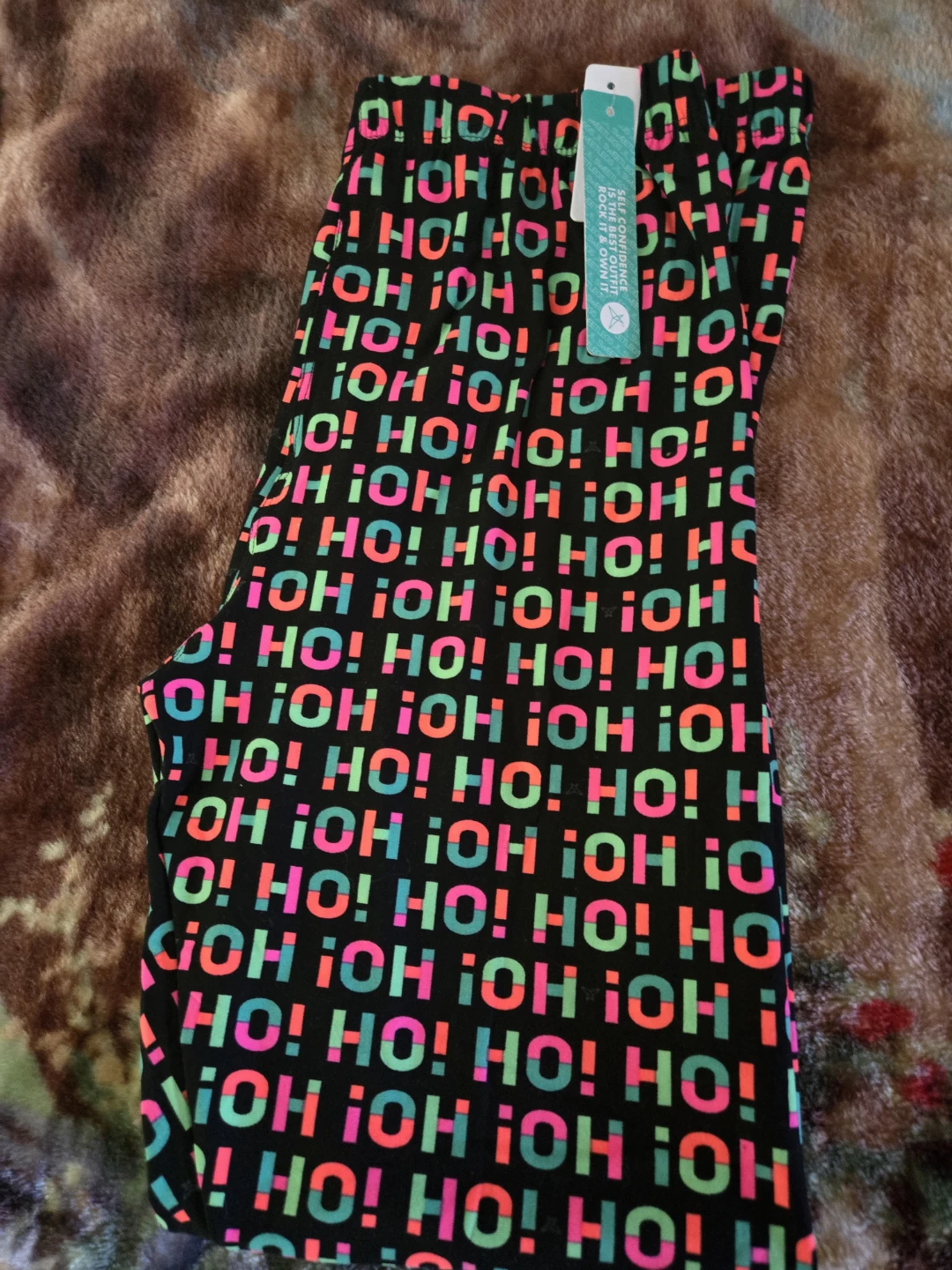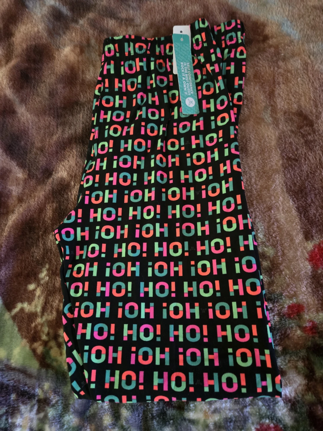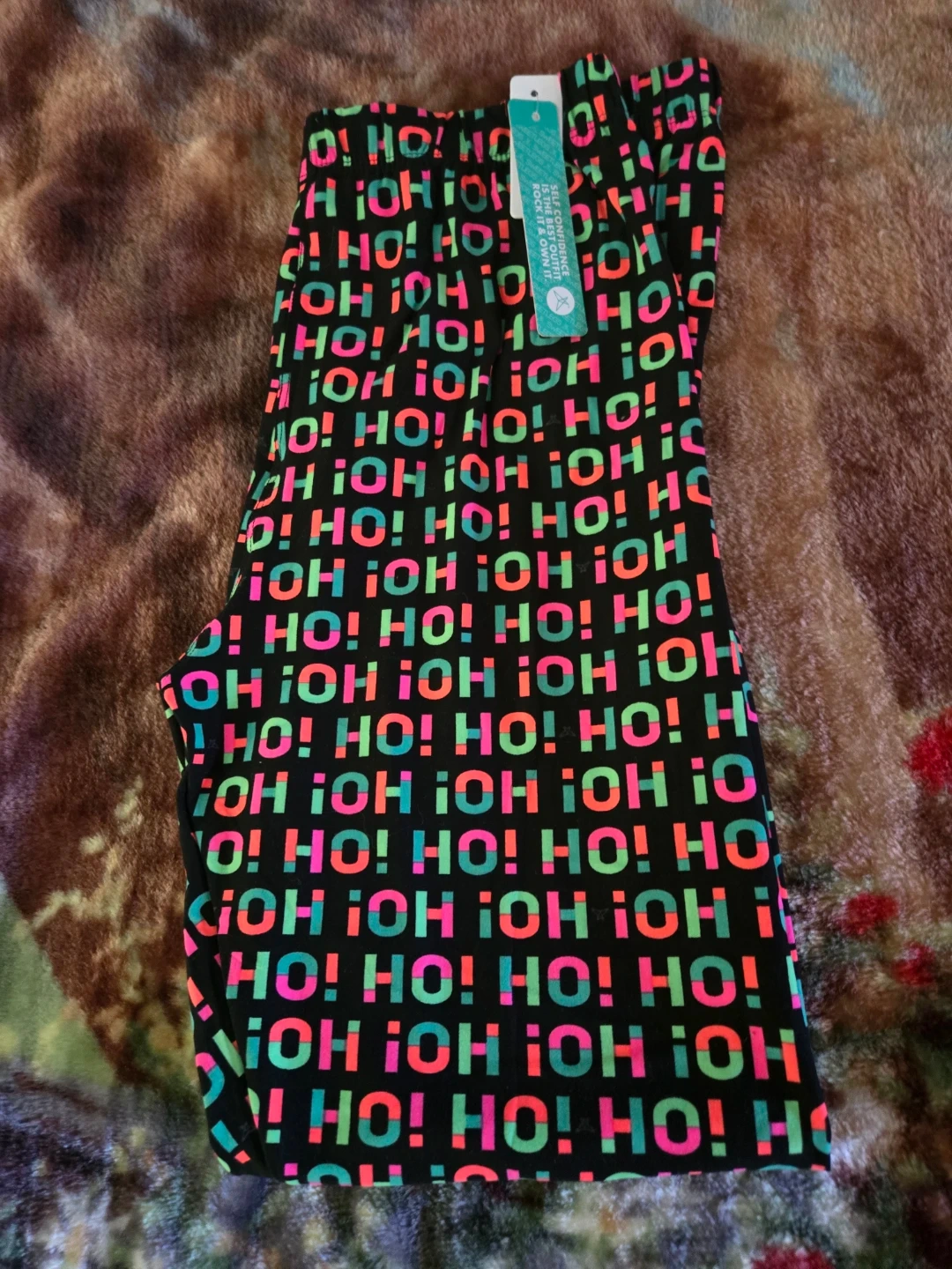 Fun and festive leggings for the holidays! They are a size medium and feature a colourful "HO! HO! HO!" pattern on a black background