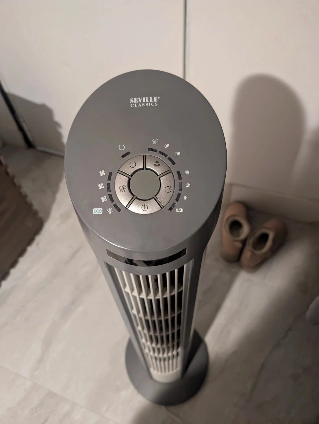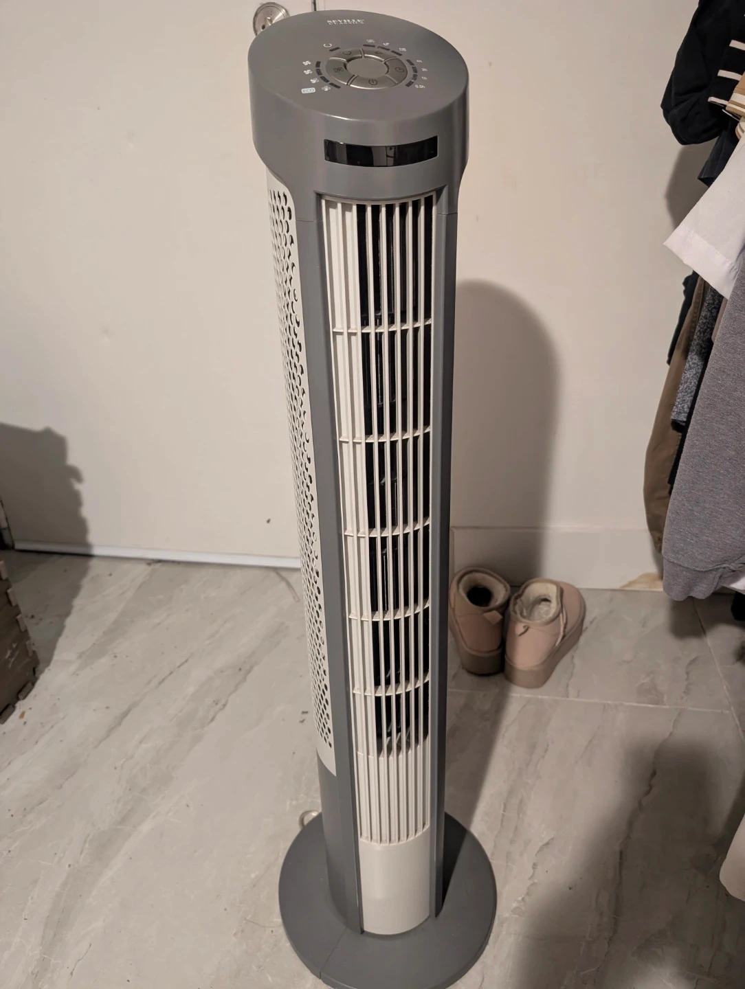 Selling a Seville Classics tower fan in grey. It's in great shape and ready to keep you cool! This fan is perfect for any room and is easy to use with multiple settings.