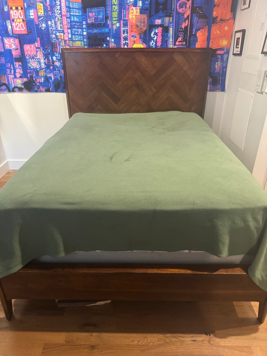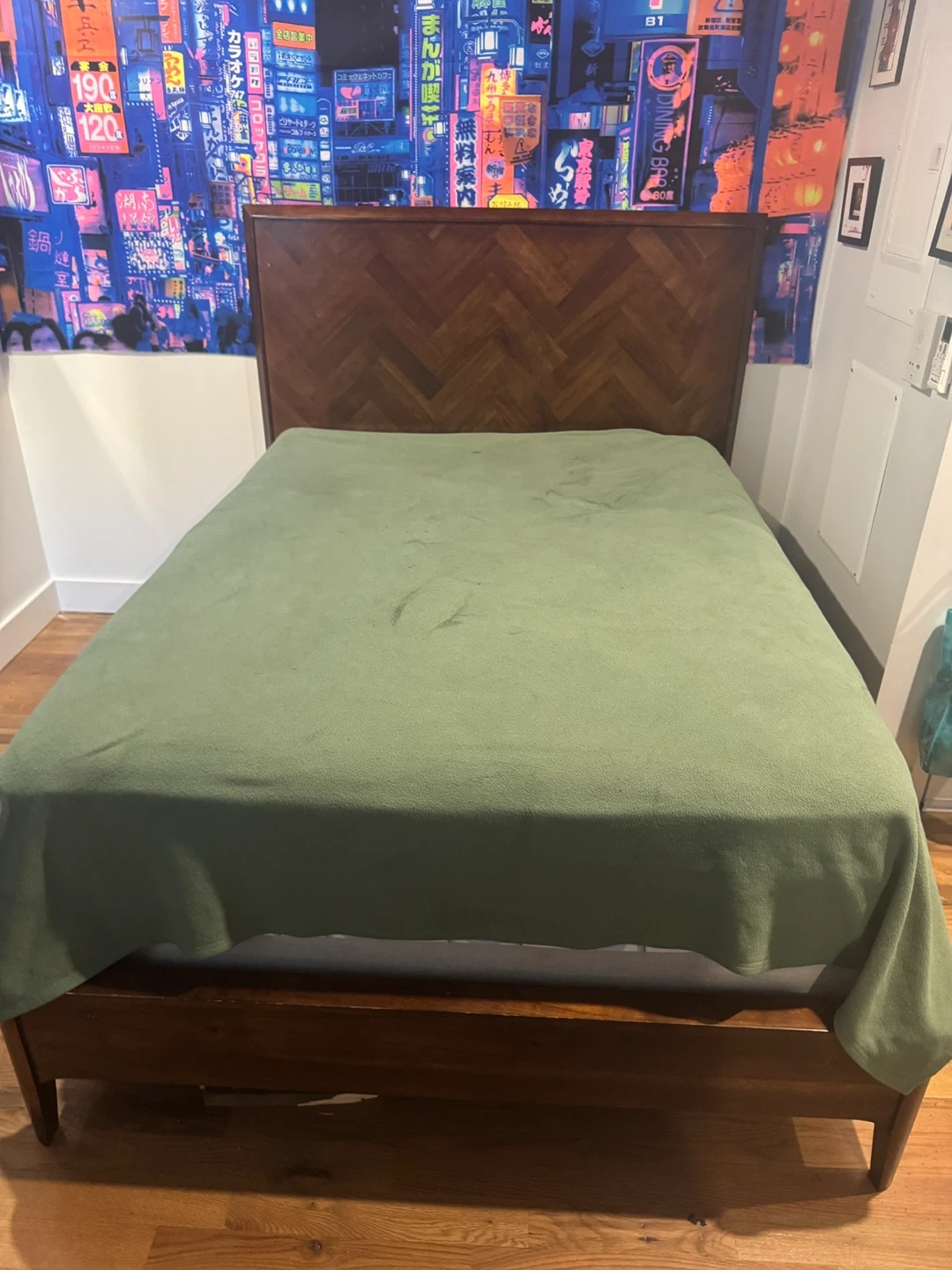 Selling a Queen-size wooden bed frame! It's in great condition and has a lovely, classic look. Perfect for adding a touch of warmth to your bedroom
