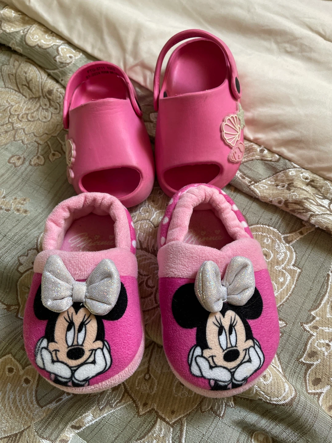 I have a set of toddler shoes for sale! There's a pair of Minnie Mouse slippers and a pair of pink sandals. Both are in toddler size 5 and ready for a new owner