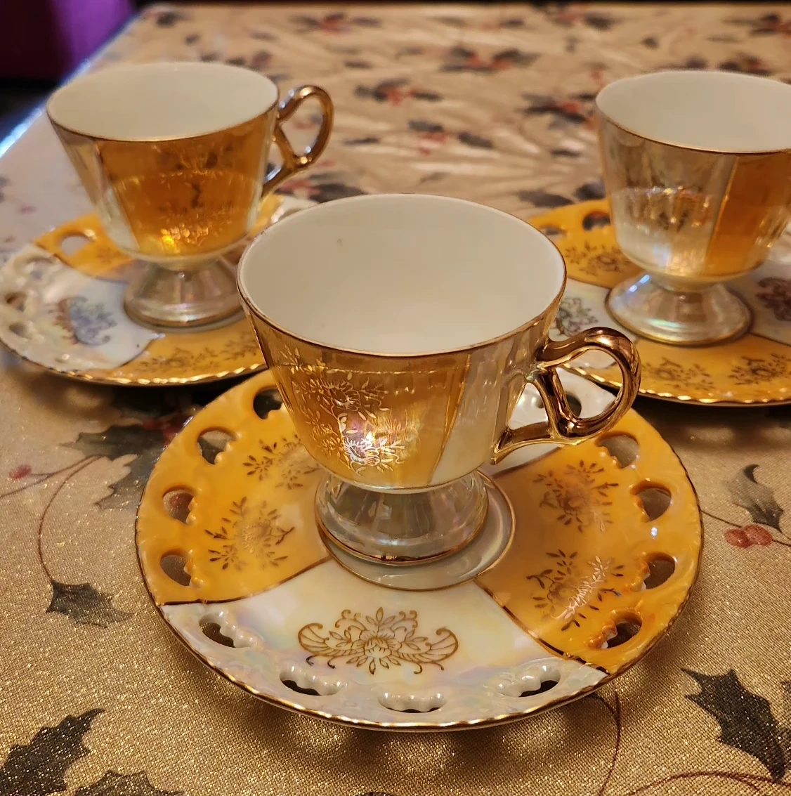 Here's a beautiful vintage tea cup and saucer set! The cups have a unique pedestal base and a lovely gold accent. The saucers have a decorative cut-out design. Perfect for adding a touch of elegance to your tea time.