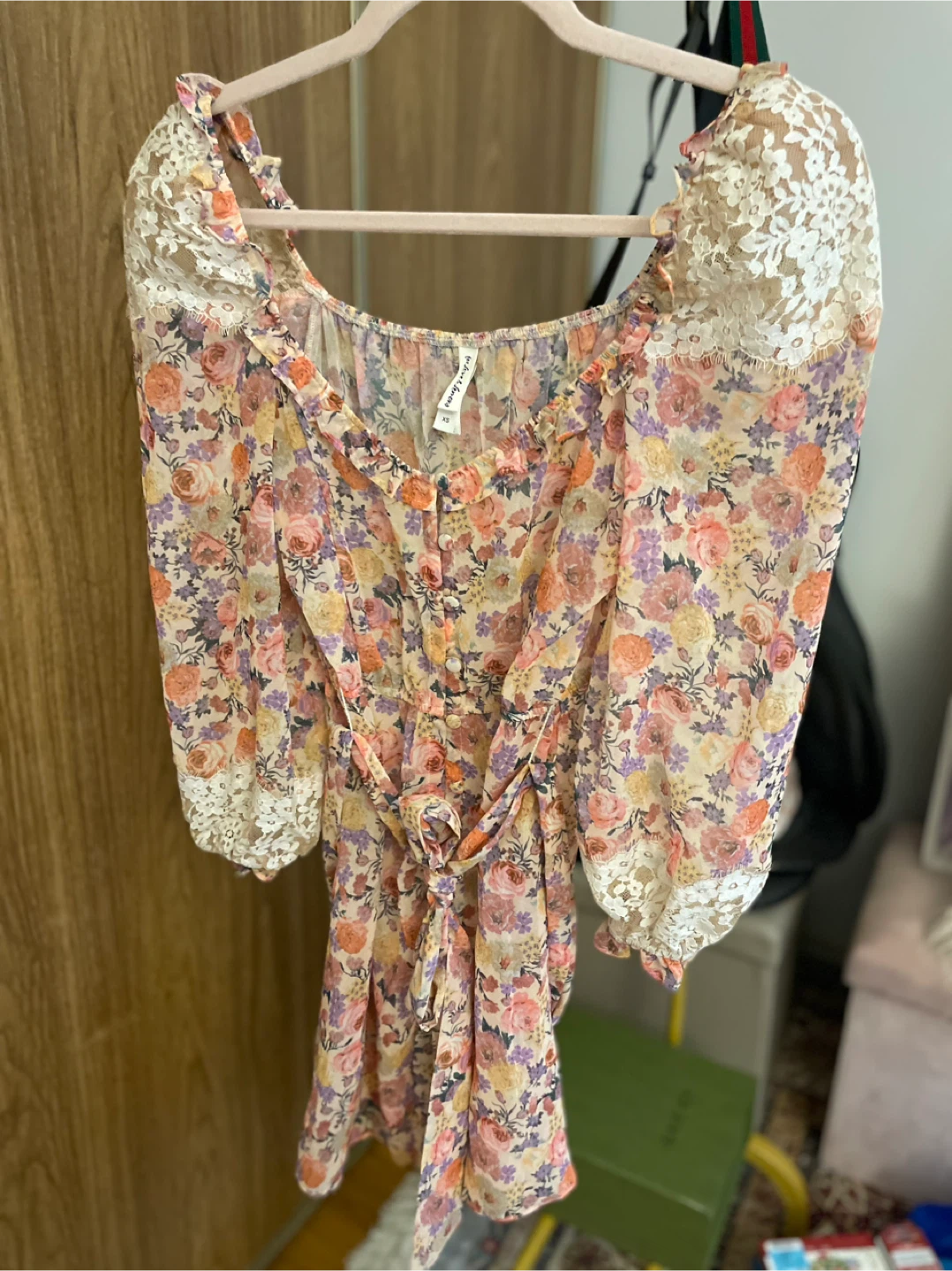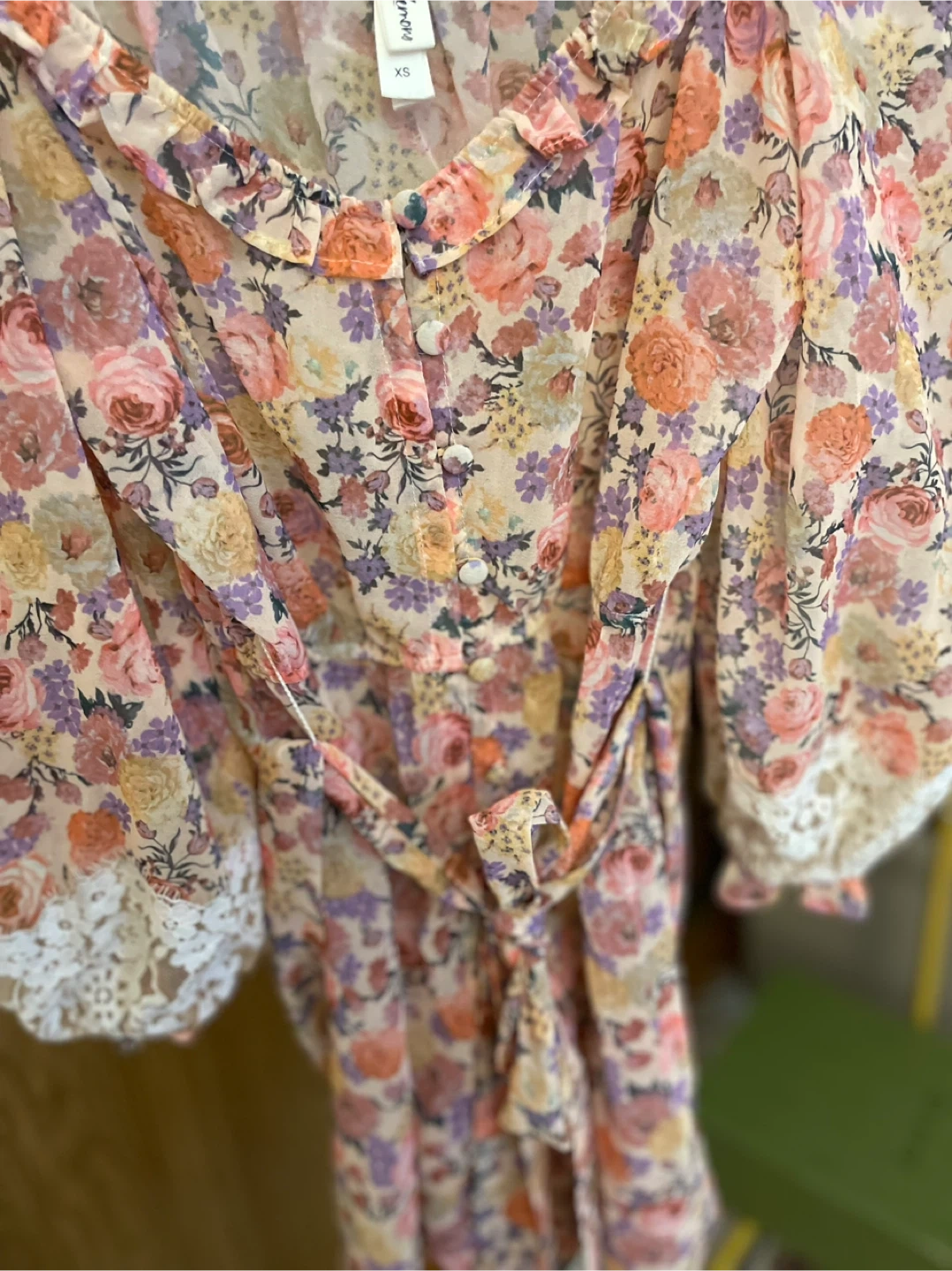 Selling a beautiful floral dress from For Love & Lemons! It's a size XS and features a lovely floral pattern with lace detailing on the sleeves. Perfect for a special occasion or just to add a touch of elegance to your wardrobe