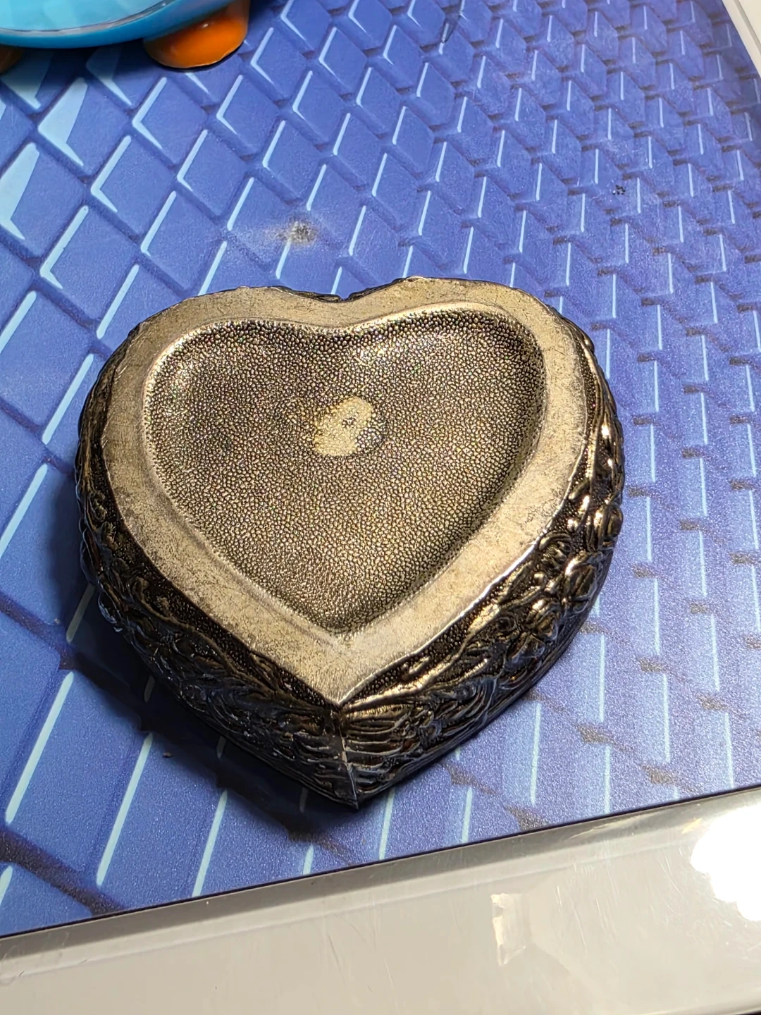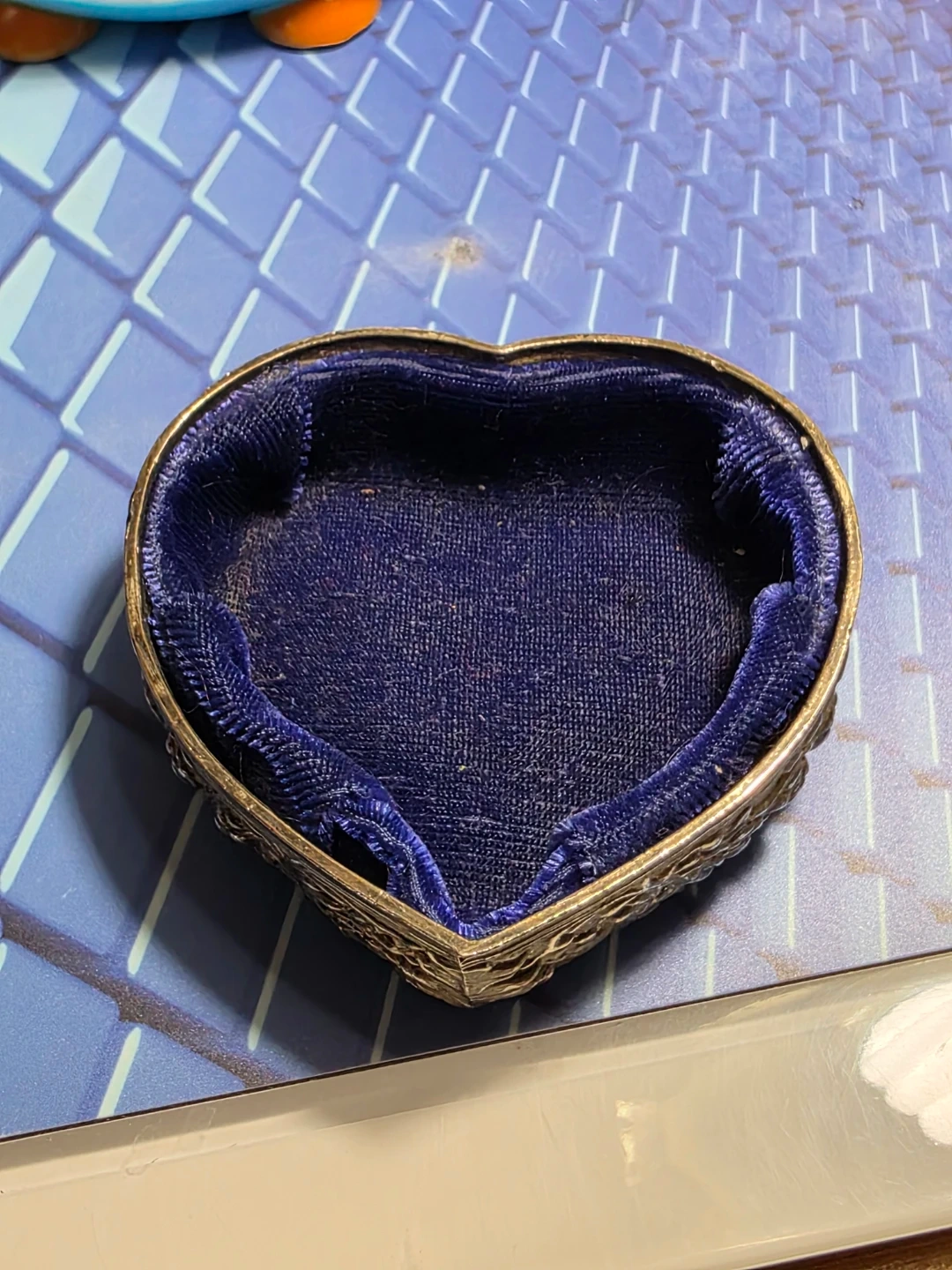 Here's a lovely heart-shaped trinket box! It's made of silver metal with intricate detailing on the outside. The inside is lined with a soft, dark blue velvet material. Perfect for storing small treasures or jewellery!
