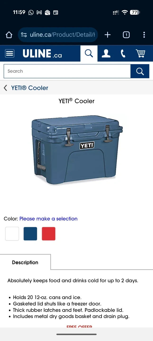 This cooler keeps food and drinks cold for up to 2 days! It holds 20 12-oz cans and ice. The lid is gasketed and shuts like a freezer door. It also features thick rubber latches and feet, a padlockable lid, and includes a metal dry goods basket and drain plug