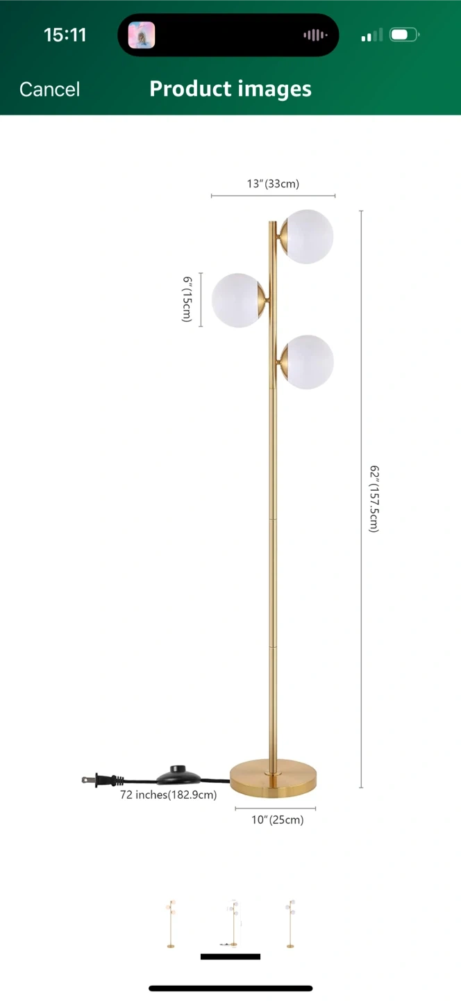 The lamp stands at 62 inches (157.5cm) tall, with a base diameter of 10 inches (25cm). Each globe is 6 inches (15cm) in diameter, and the overall width is 13 inches (33cm). The cord length is 72 inches (182.9cm)