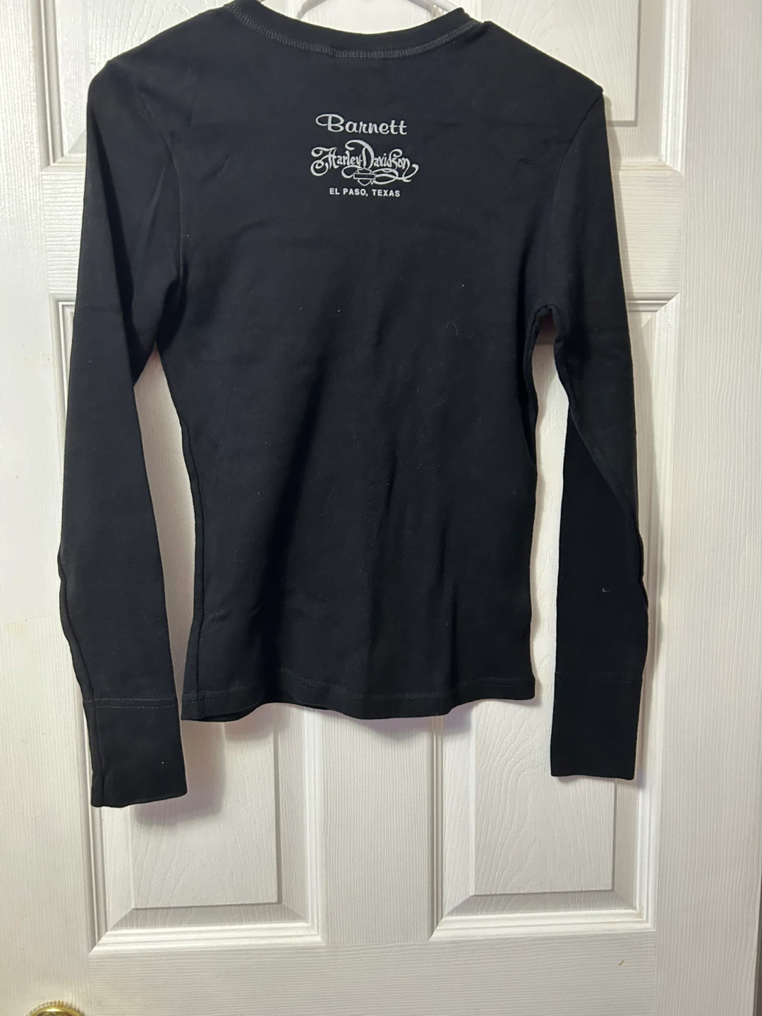 Harley-Davidson long sleeve top in size small! It's a black top with a decorative design on the front and "Barnett Harley-Davidson El Paso, Texas" on the back. It's in great condition and ready for a new home!